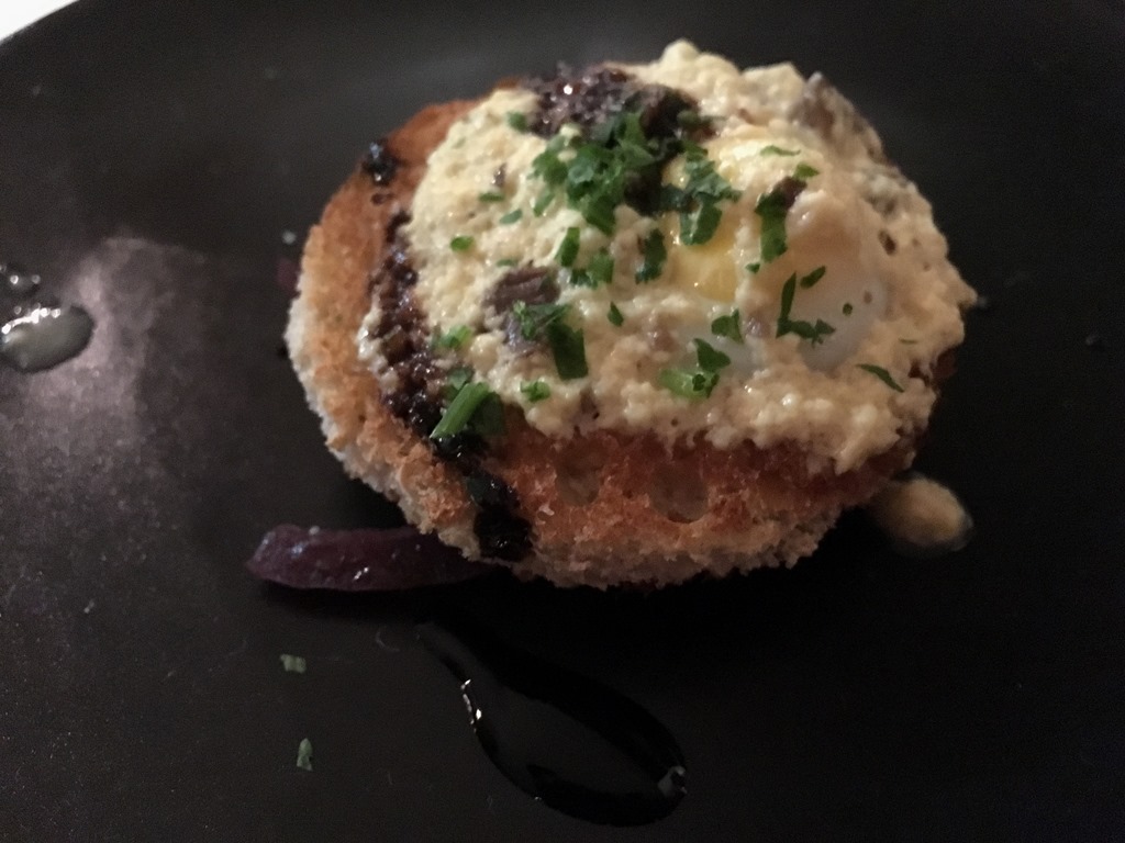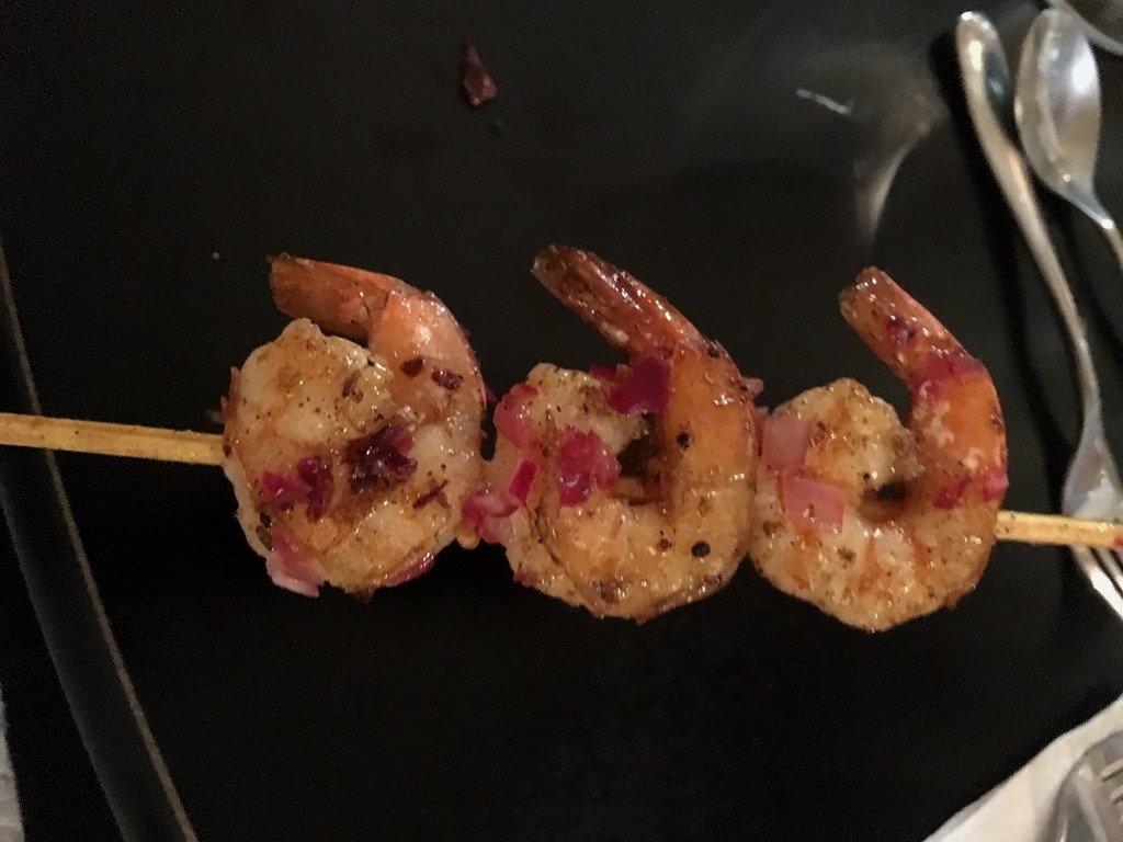Espetinho de camarão com especiarias e Torrada com ovo de codorna trufado e confit de cebola roxa.