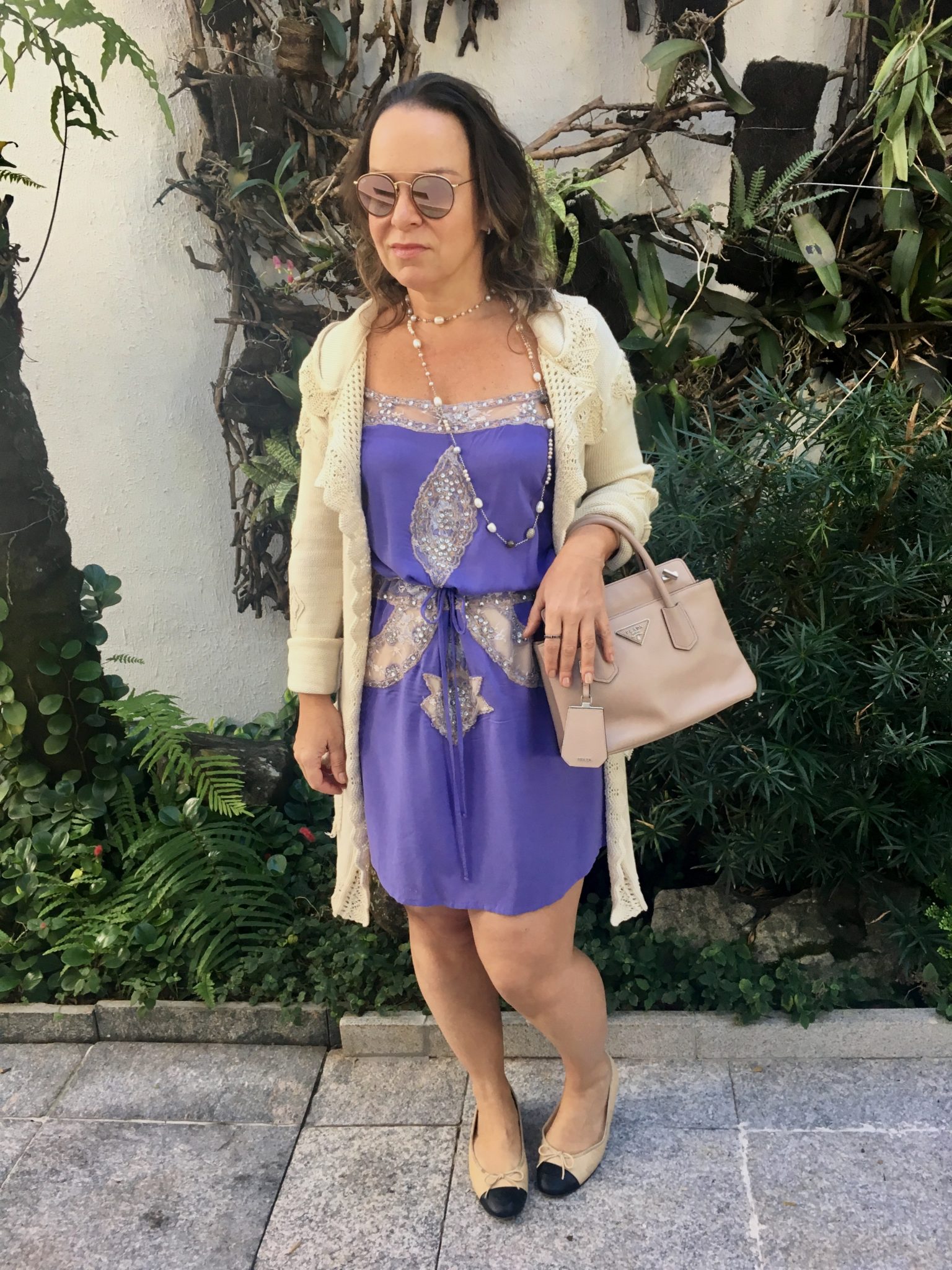 Embora já fosse junho, ainda não estava tão frio. Aproveitei para usar um vestido antiguinho da Mares estilo camisola nessa cor tão linda! Coloquei um casacão de tricô e sapatilhas. O resultado ficou chiquezinho, mas o conforto continuou sendo a prioridade! Como sempre em looks de fim de semana, né?