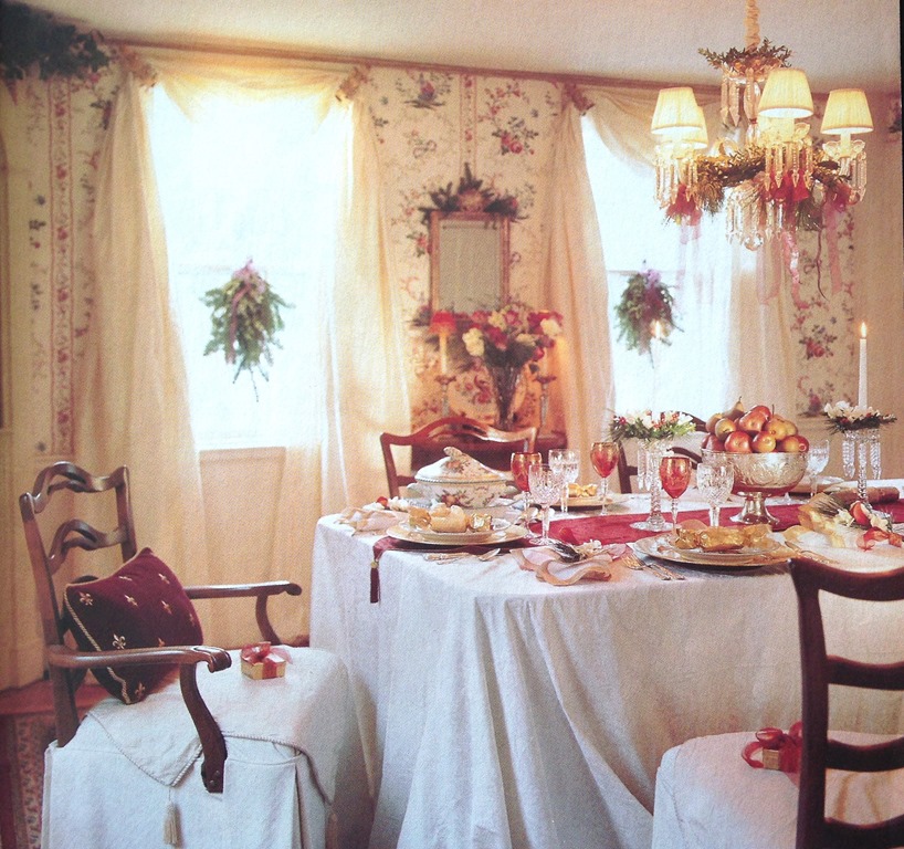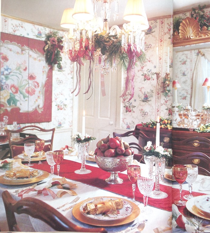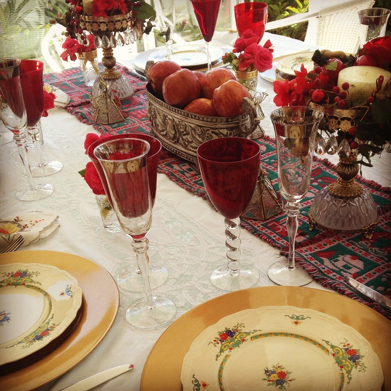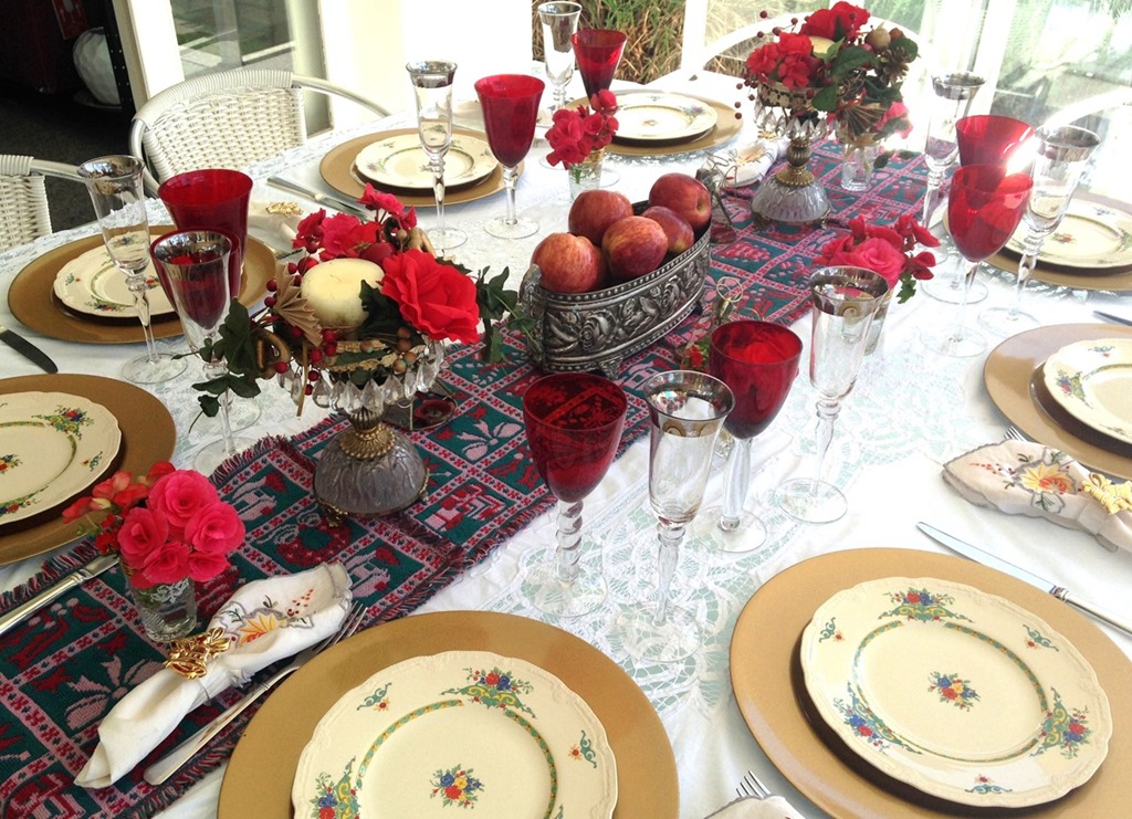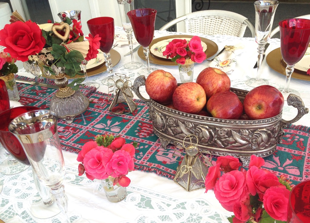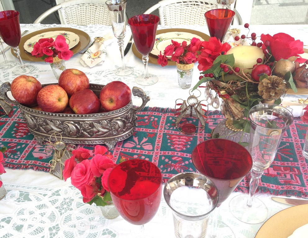Faltou falar da mesa : olhem que linda a minha inspiração! Sousplats dourados, pratos florais, castiçais de cristal, toalha branca com passadeira vermelha por cima, flores vermelhas e taças também, e no meio, um lindo arranjo de maçãs vermelhas.