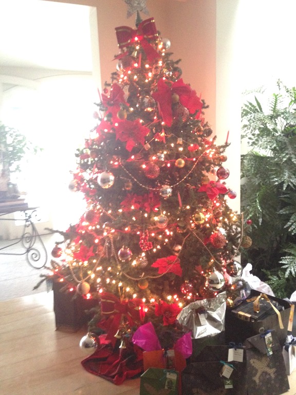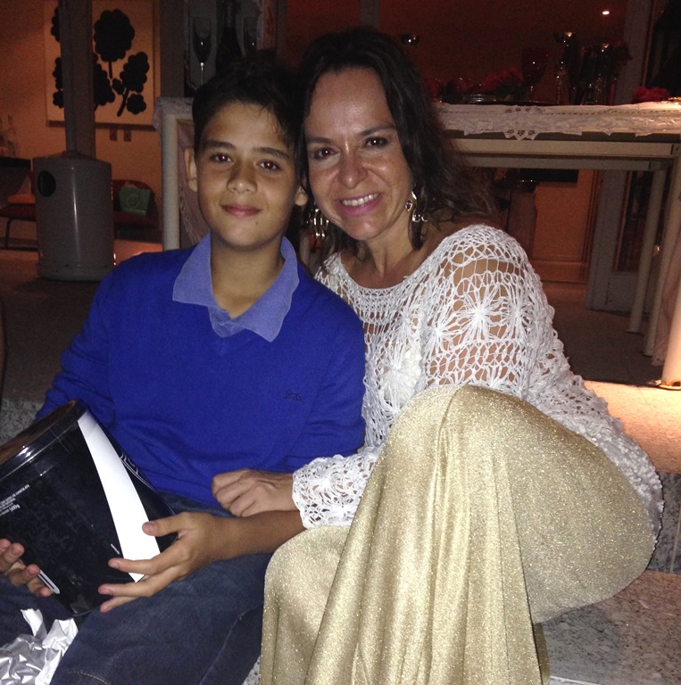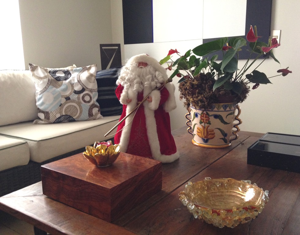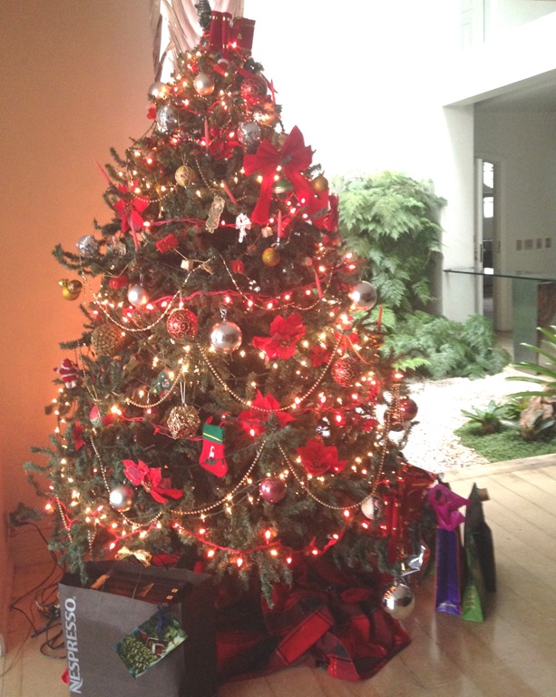 A árvore – estrela da festa – também passeia pela casa, e dessa vez, ela ficou perto do jardim interno. Dessa forma, quando acesa, mostra suas luzes tanto para a área externa, que é onde ficamos, como para dentro da casa! By the way, aqui começa cedo – 19 horas-para que os pequenos aproveitem mais!