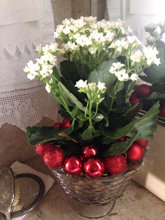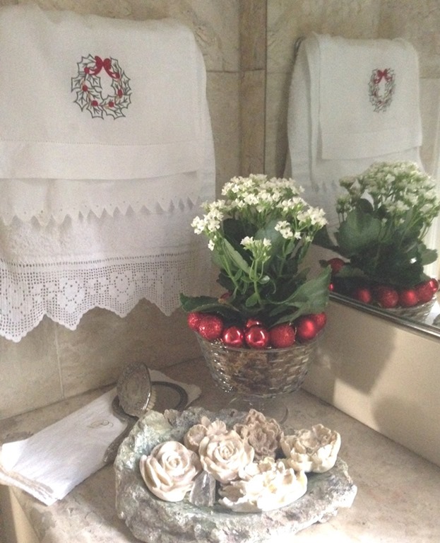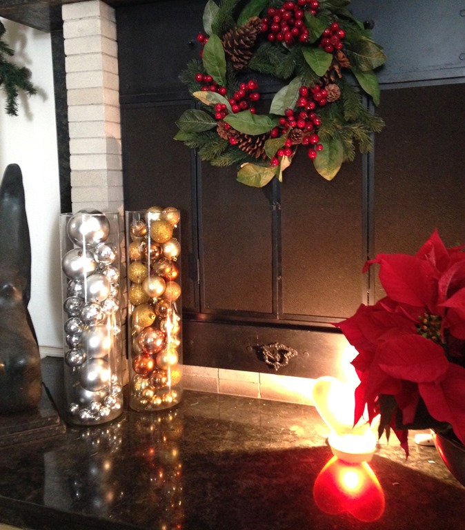 Me inspirei também nesse arranjo com bolas vermelhas para montar um parecido no meu lavabo.