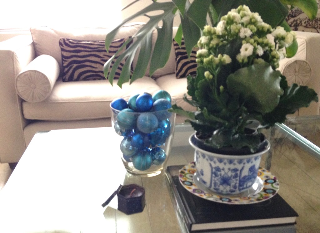 A ideia era fazer uma árvore tradicional não só com enfeites vermelhos delicados, como também com guirlandas e luzes . Além disso, quis montar esse cantinho com toque de oncinha , vaso azul e flores brancas.
