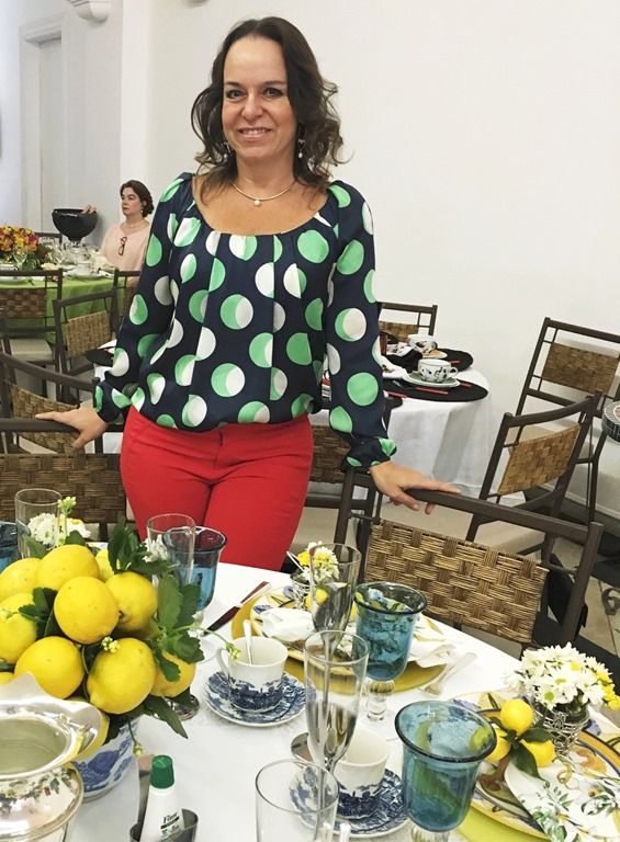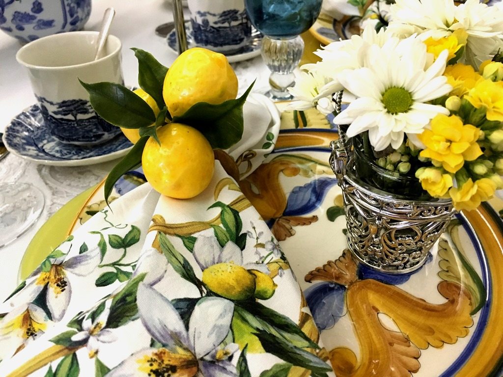 Os limões dos porta-guardanapos e dos guardanapos conversavam com o arranjo do centro da mesa. E o amarelo das flores e da faiança compunham o esquema de cores.
