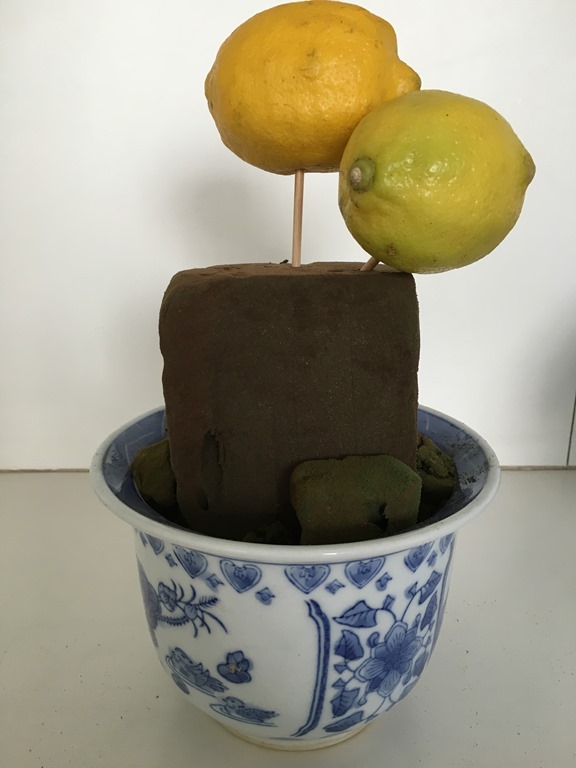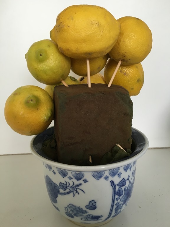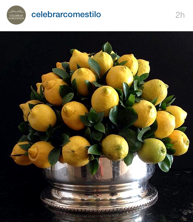 Para espetar o limão siciliano na espuma floral use palitos de churrasco.Espete o primeiro no centro, mais alto, e depois vá espetando os outros simulando um círculo – lembre-se: seu arranjo deve ficar bem preenchido e bem redondinho, então use altura diferentes do espeto. Depois de todos os limões colocados, comece a preencher com as flores ou folhas,  preenchendo todos os espaços.