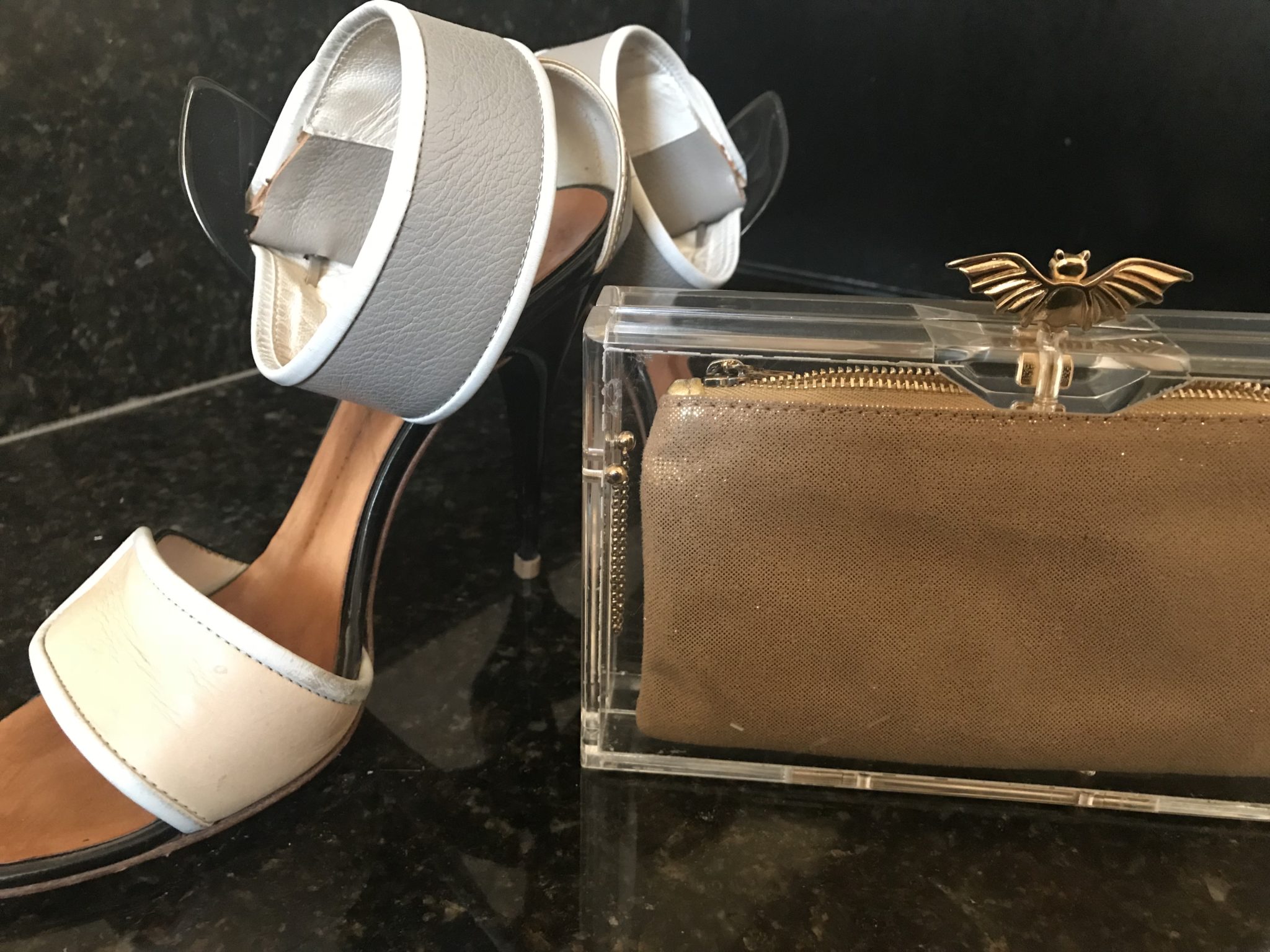 Exatamente o que eu queria: o sapato bicolor GUISSEPE ZANOTTI e a clutch dourada CHARLOTTE OLYMPIA.