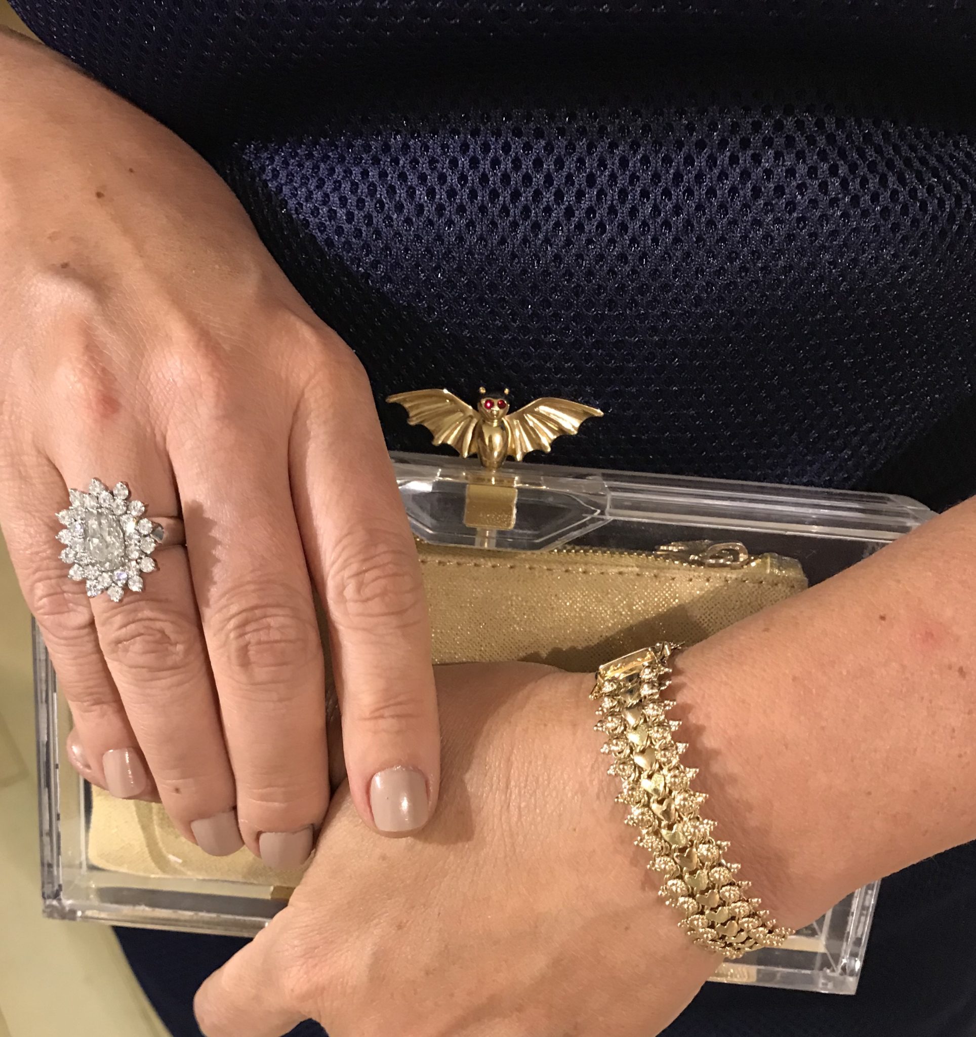 Brilhantes no brinco e no anel e uma pulseira em ouro amarelo que conversava com a bolsa e a pedra do brinco.