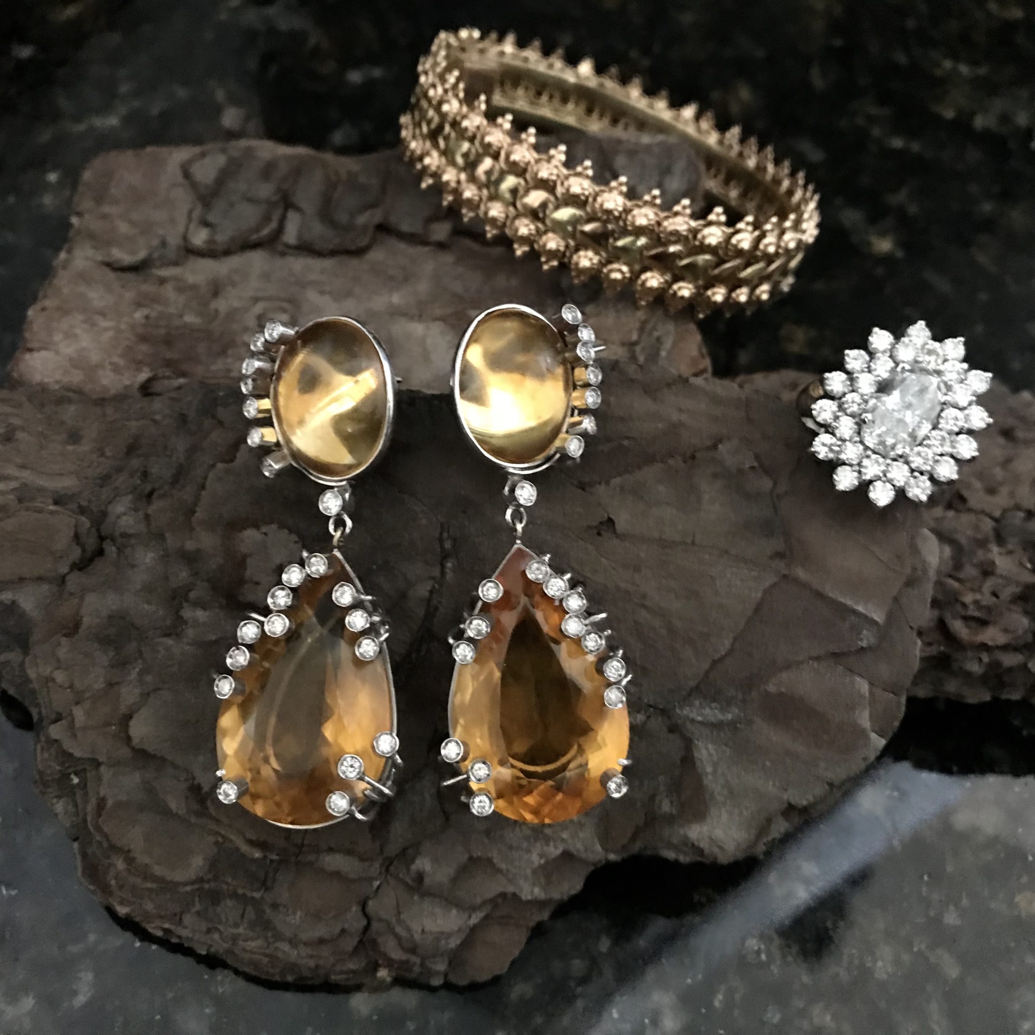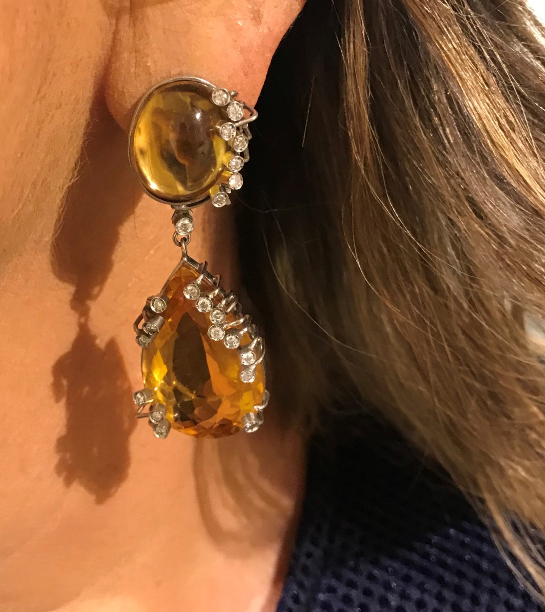 Testei safiras e elas “morreram” no look. Testei depois ouro amarelo e citrine inspirada pela foto da LOUIS VUITTON e amei a combinação.