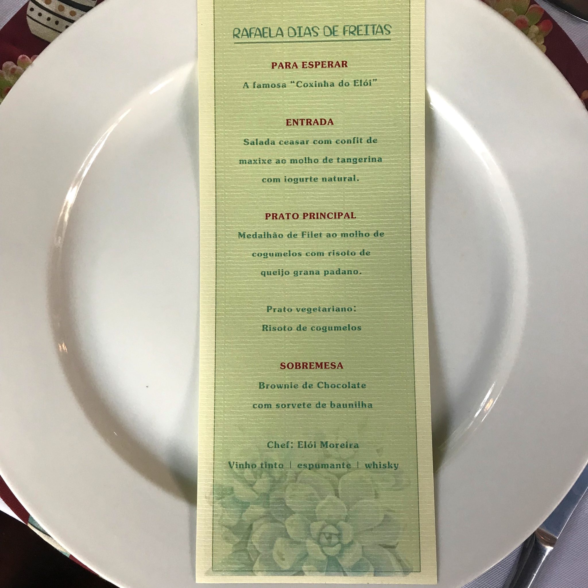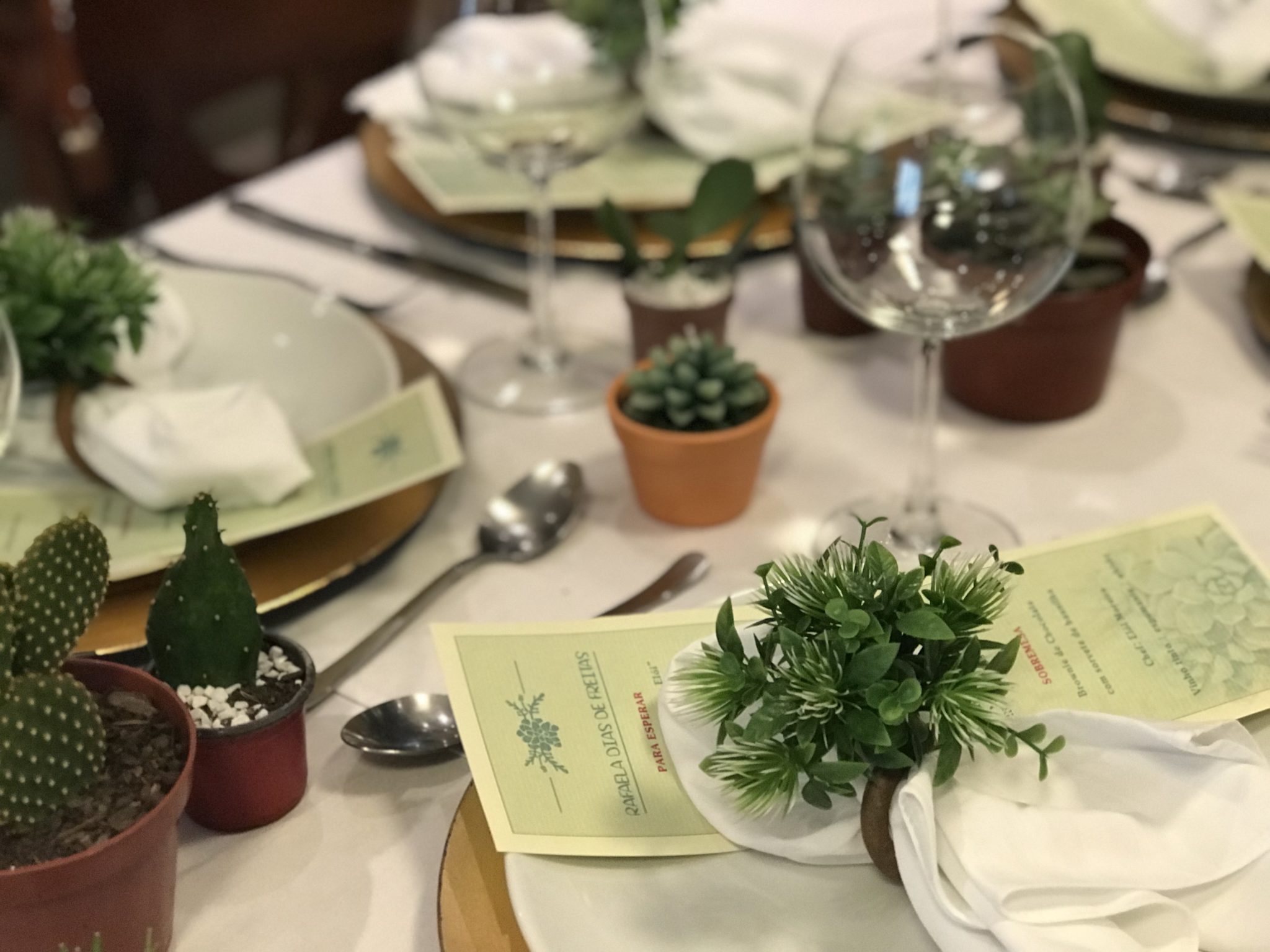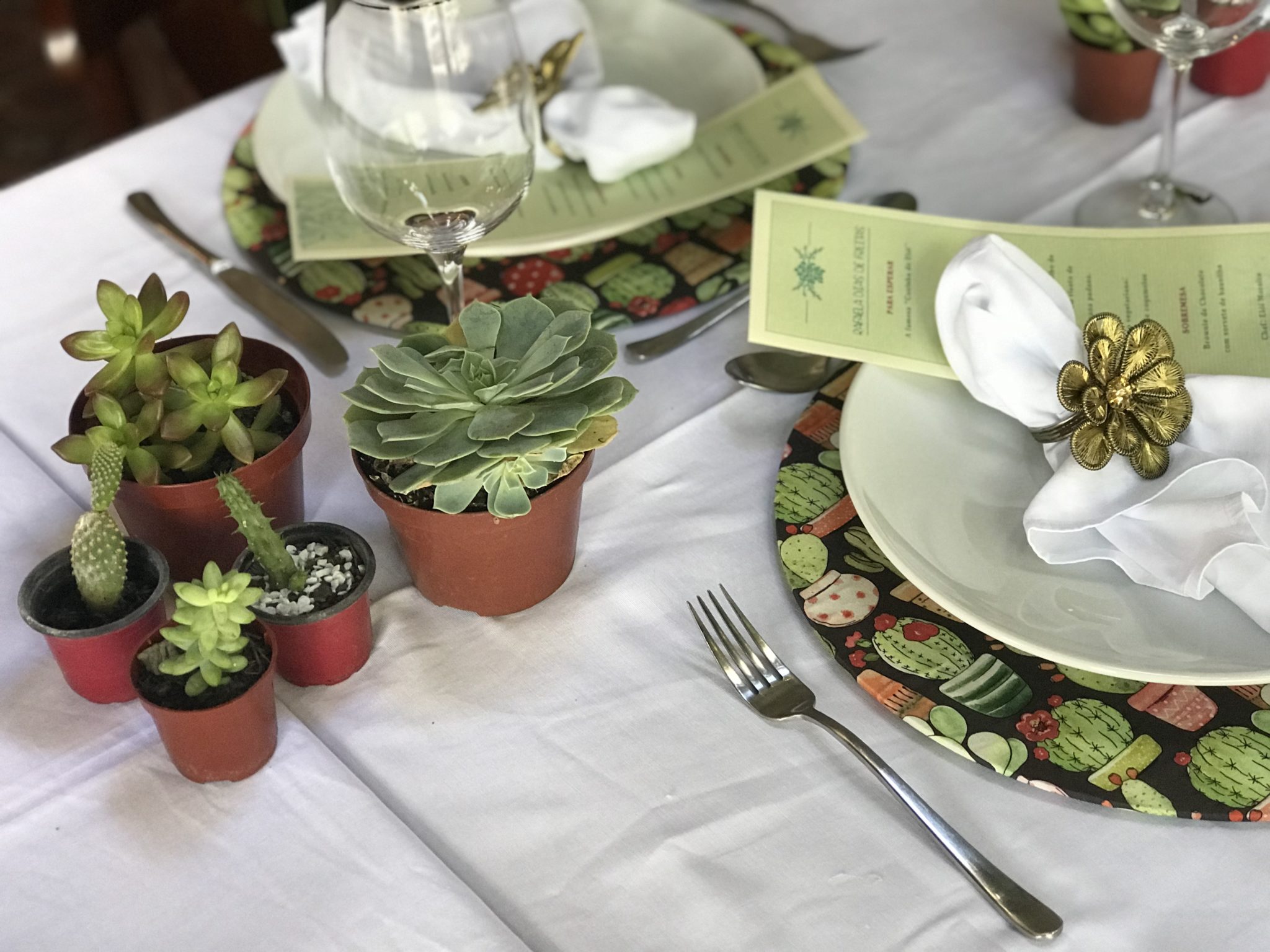 Mandei também imprimir o menu com uma arte de suculentas, dando uma unidade a tudo isso. As plantas comprei na HOLAMBELO , um entreposto de flores no Bairro Bonfim que vende tudo com ótimos preços. Cada vasinho desse custou de R$2,50 a no máximo R$8,50. Sendo tão barato, a gente compra muito sem dó.