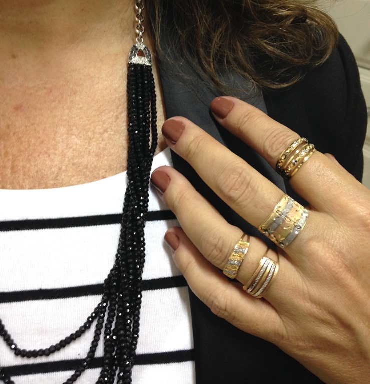 Esse colar de espinélios é uma peça interessante e versátil, tanto pela cor fácil , quanto pelo uso. O mix de aneizinhos deixa qualquer look mais jovial, e o colar é o link de todos os looks.