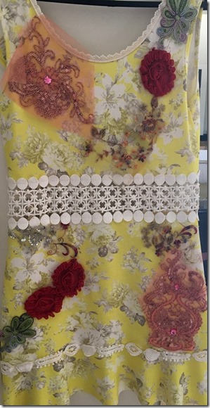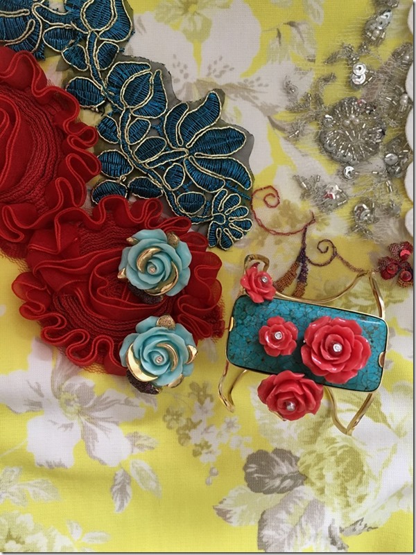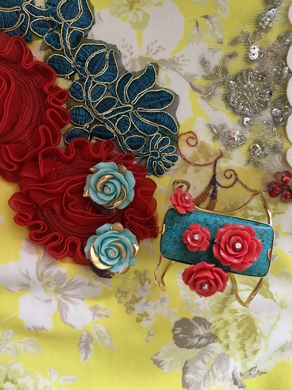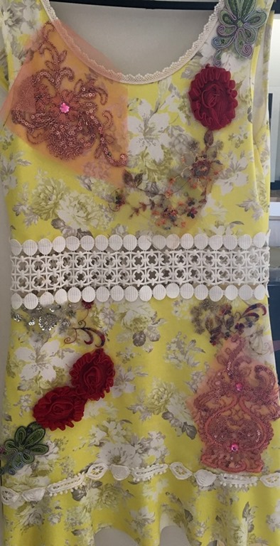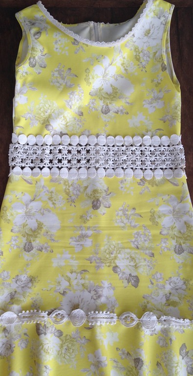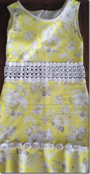 Peguei um vestidinho de malha amarelo da TAHARI como plano de fundo e me pus a montar uma composição com rendas que eu já tinha … comprei mais alguma coisa …