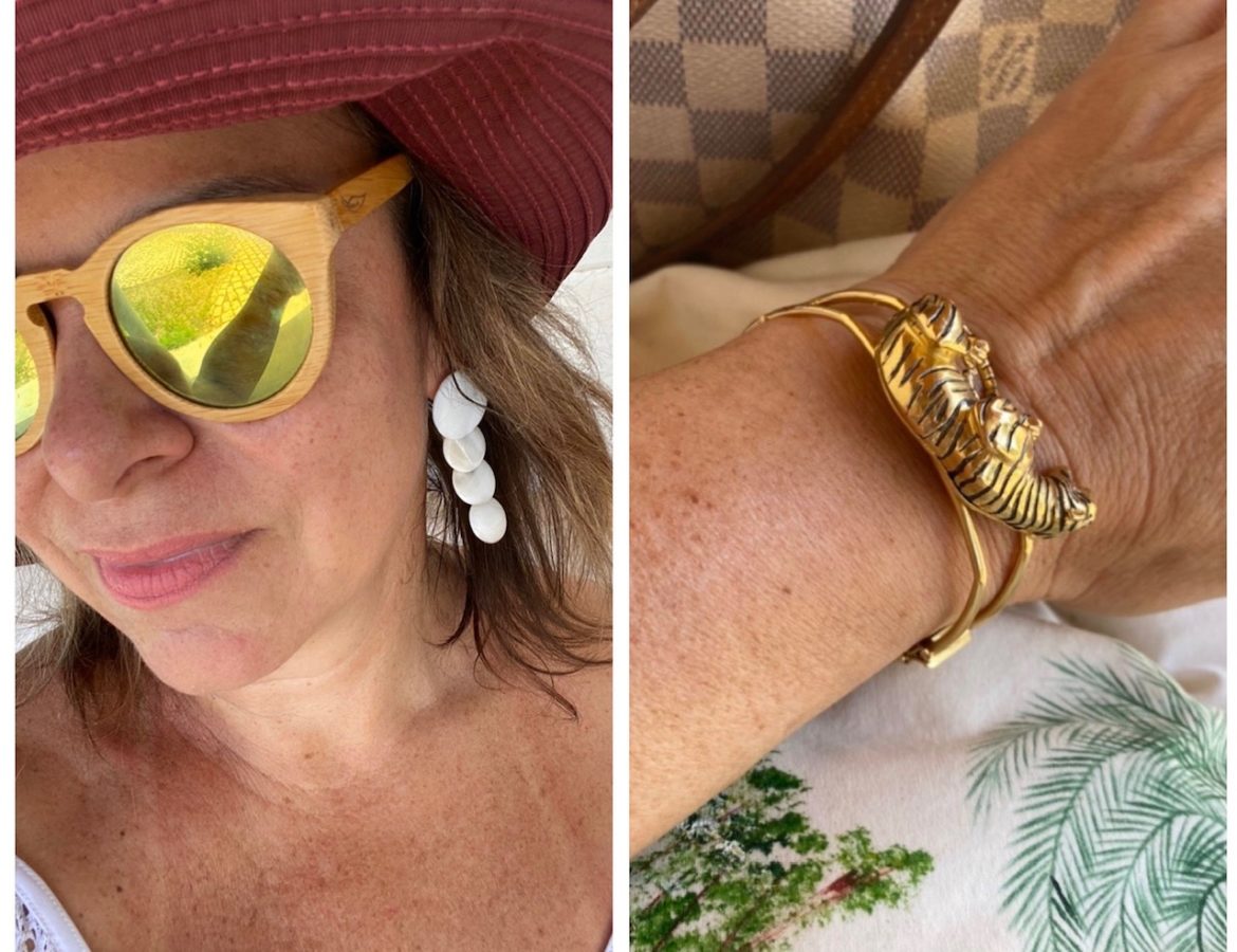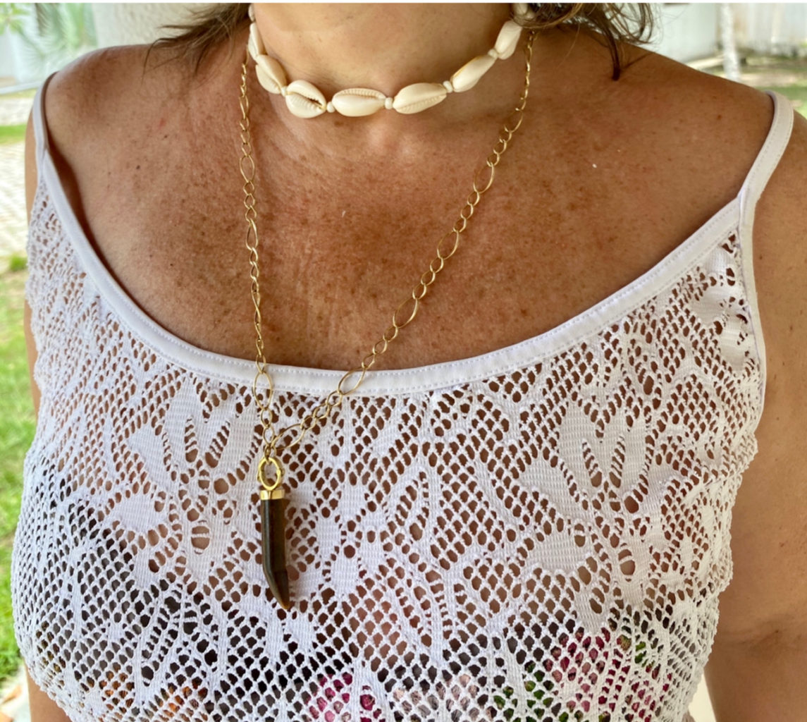 E da segunda vez, contudo, usei em versão mais praiana: o mesmo brinco com búzios e olho de tigre.