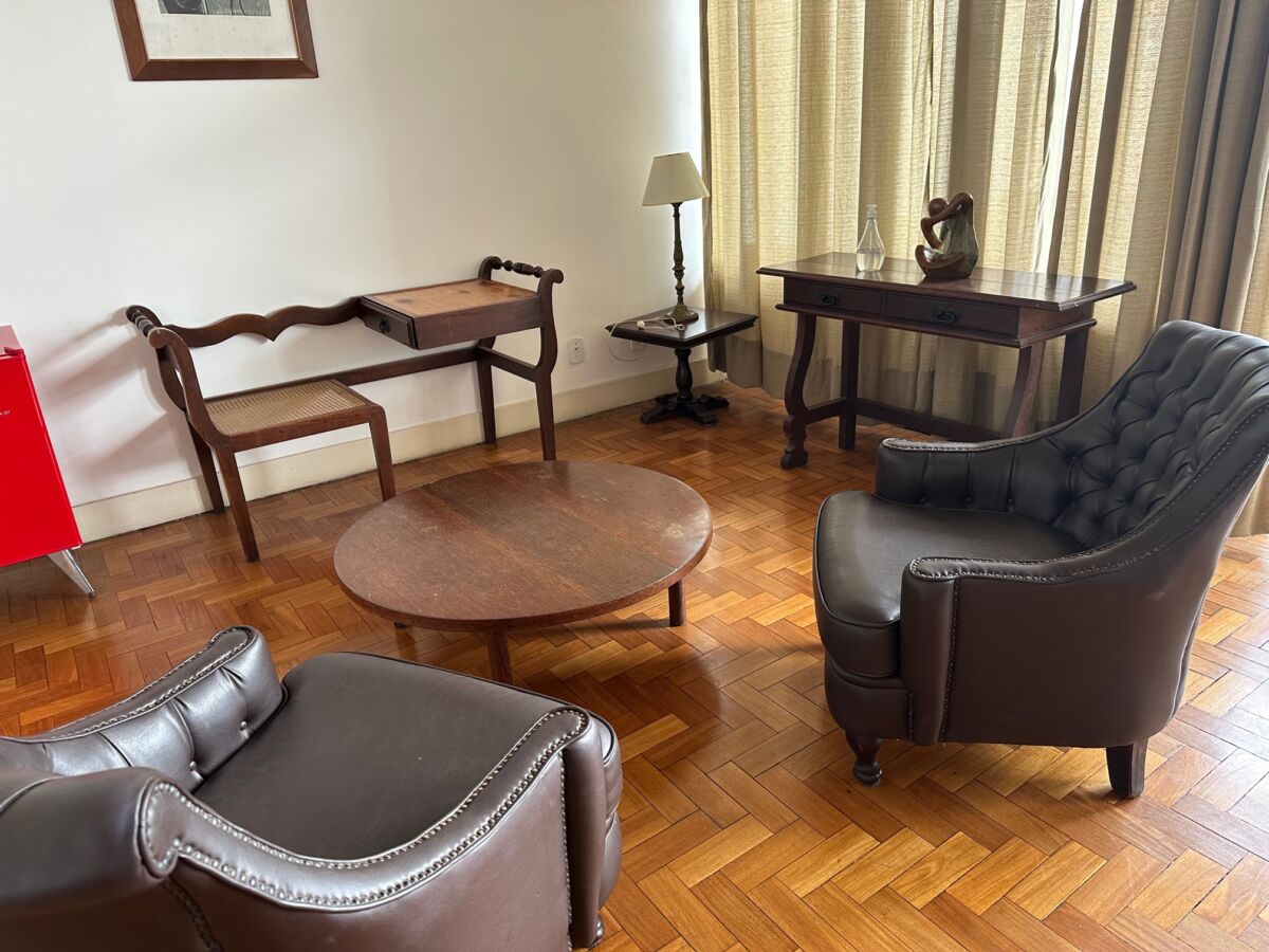 O mobiliário é discreto e autêntico da época, não só na suíte, como em todo o hotel.