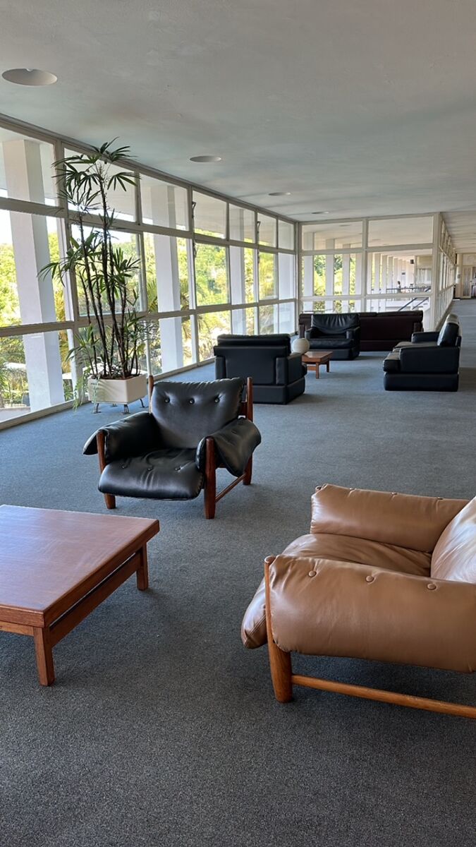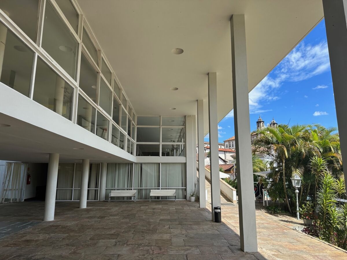 Niemeyer projetou o GRANDE HOTEL DE OURO PRETO com linhas arrojadas e retilíneas, com amplos vãos elevados sobre pilotis, cujos planos frontais totalmente envidraçados descortinam a paisagem histórica.