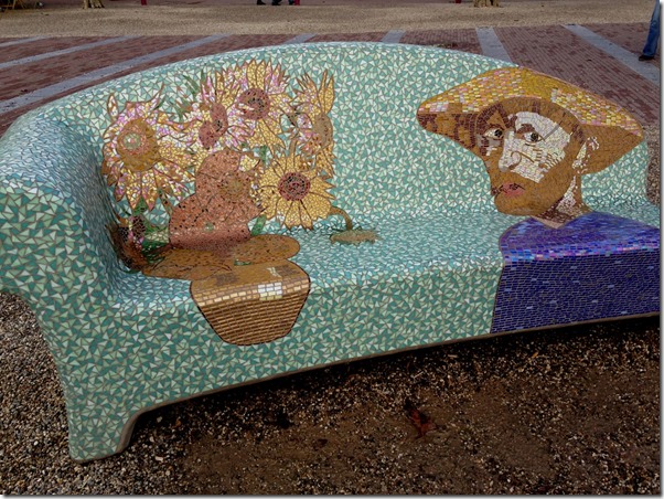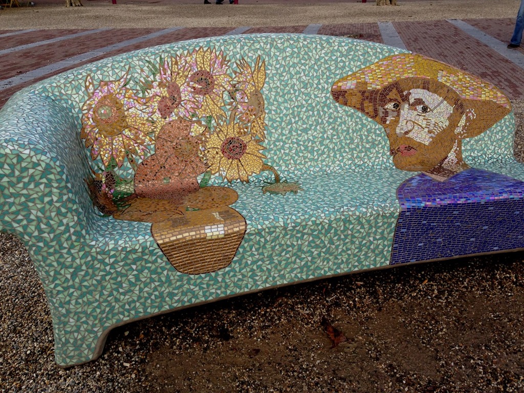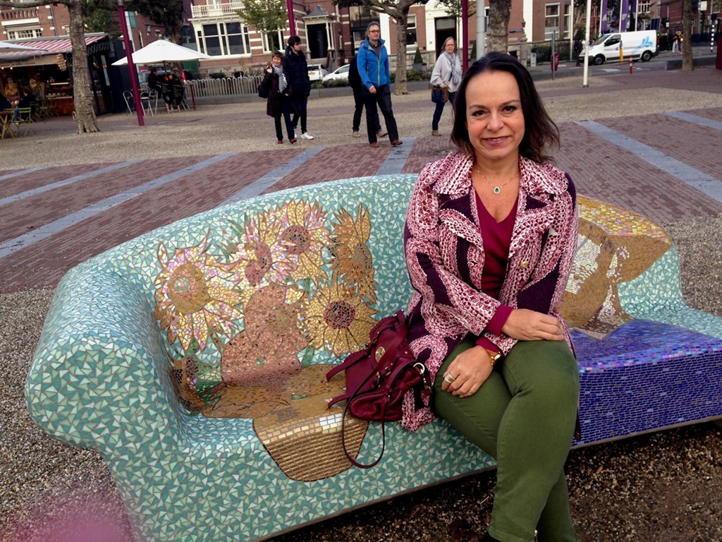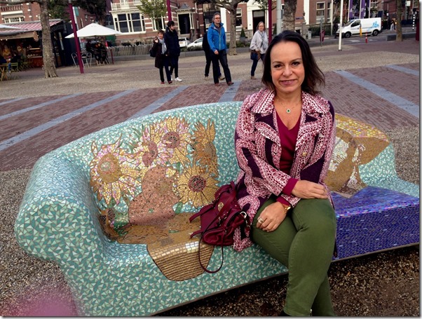 Como fui em pleno outono, me virei em Zaanse Schans mesmo, mais perto, inclusive. Os tickets são vendidos na Museumplein, no kioske de passeios. Não dá pra perder a foto na praça ne? Até o banco tem Van Gogh! rsrs