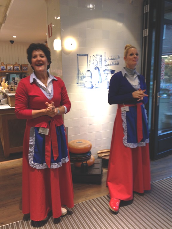 É lá também que essas holandesas com trajes típicos ( e tamancos de madeira !! ) nos ensinam sobre o queijo GOUDA e nos oferecem varios tipos para provar.