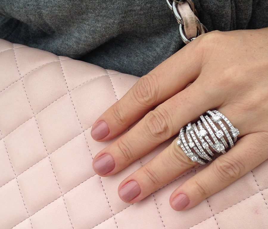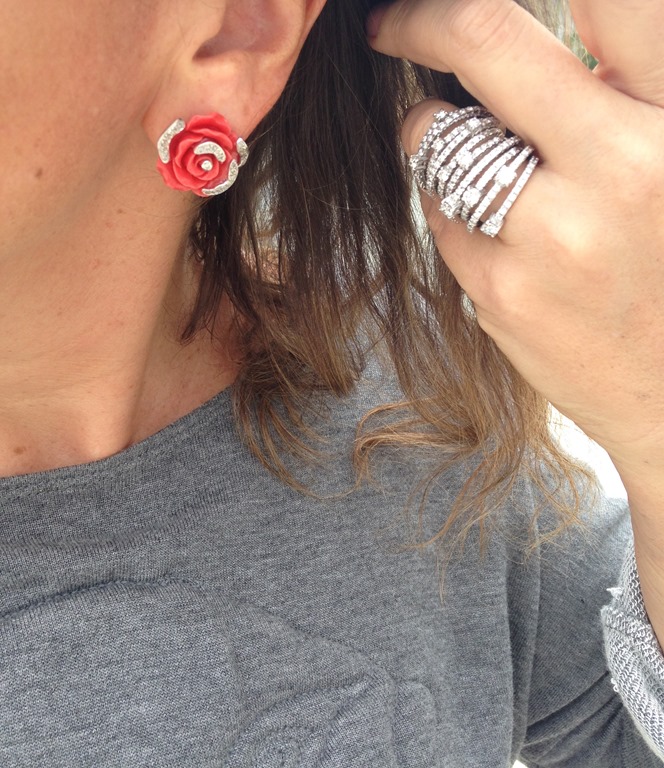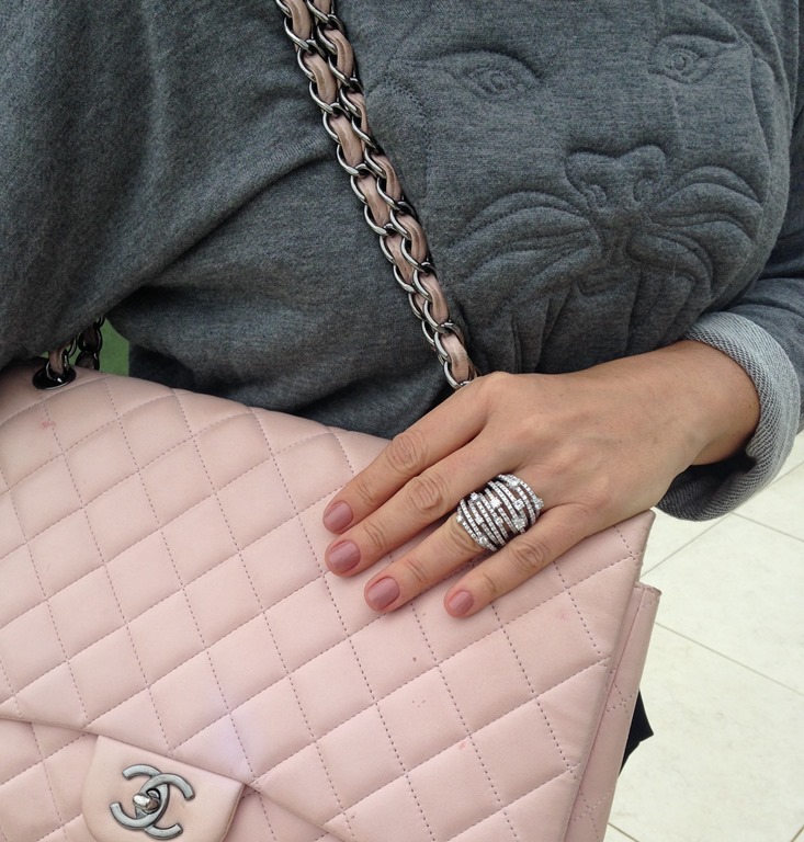 Quando os complementos são bem bacanudos, o look ganha força e pode transitar por horários e locais variados. Pensei no rosa do brinco e da bolsa para “ quebrar “ a sobriedade dos tons e um suuuper anel de brilhantes dando o tchan!