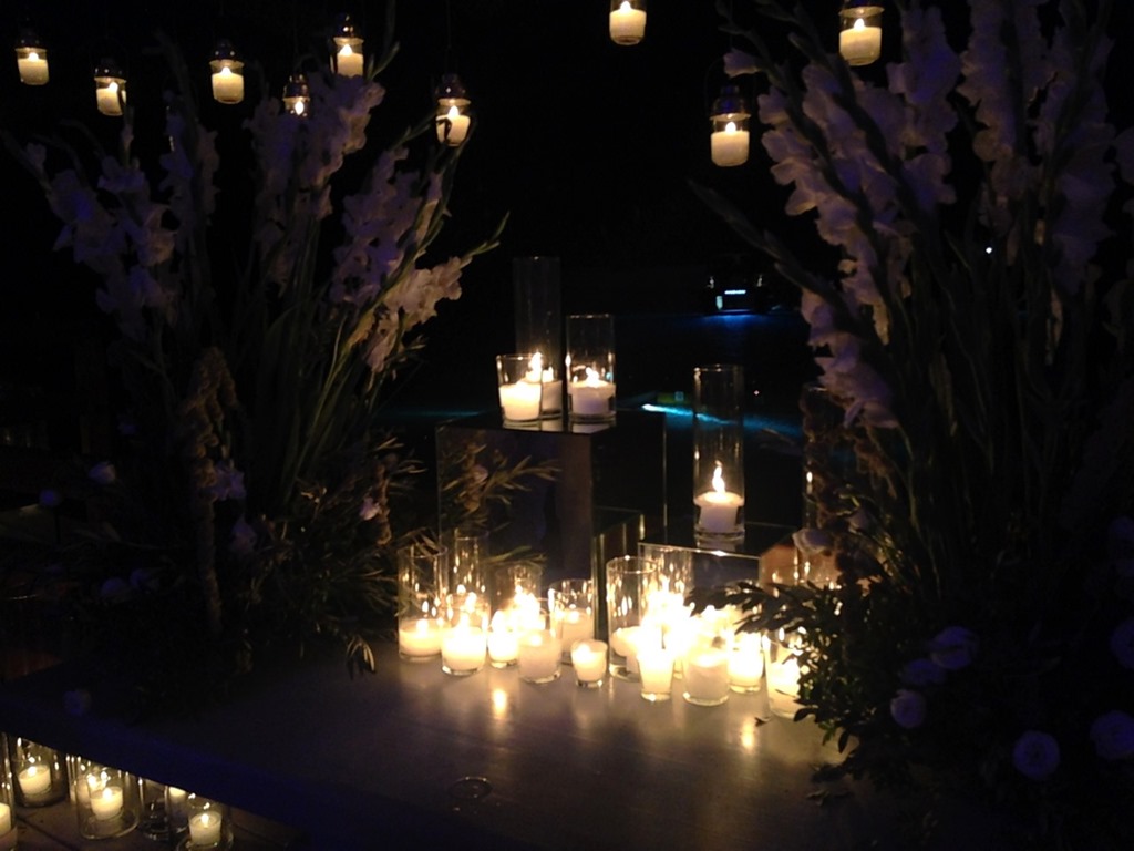 Decor todo com flores brancas e velas – super lindo com o traje branco