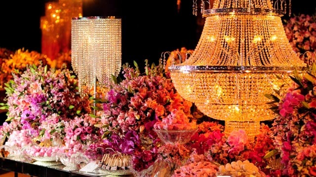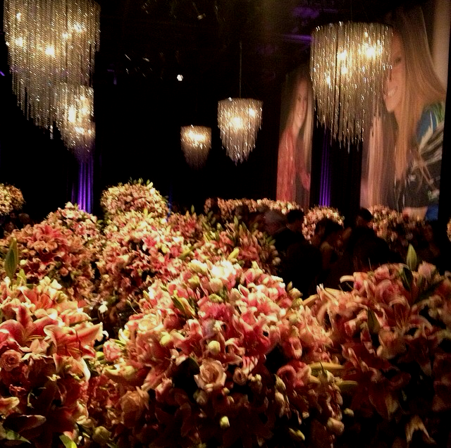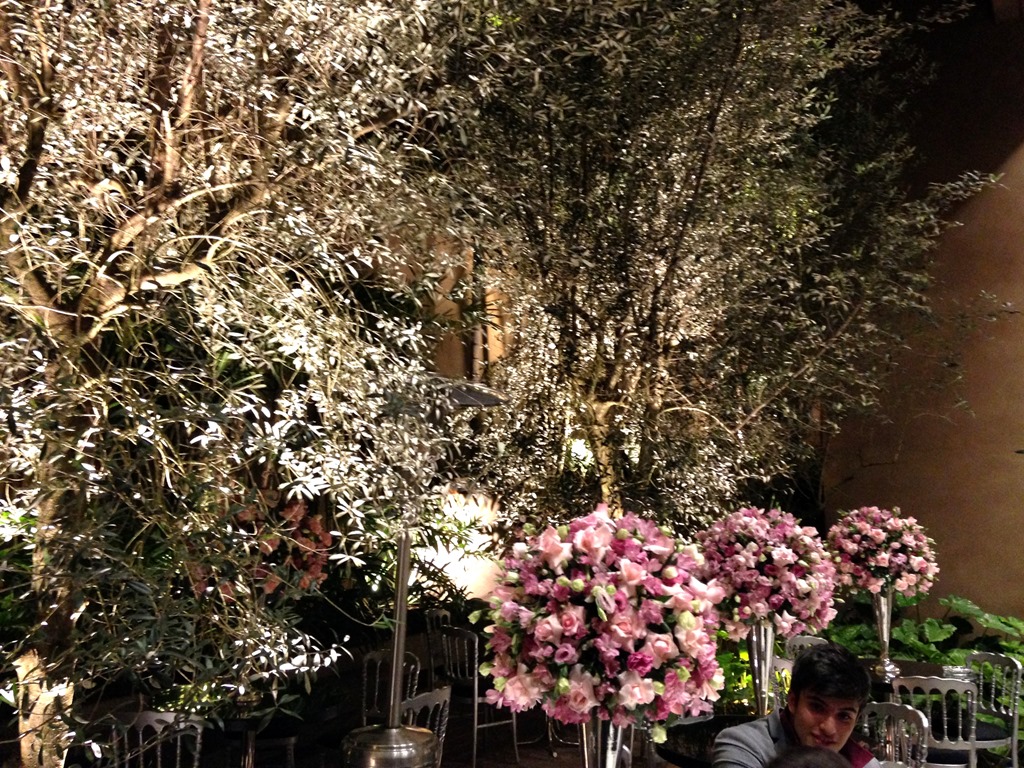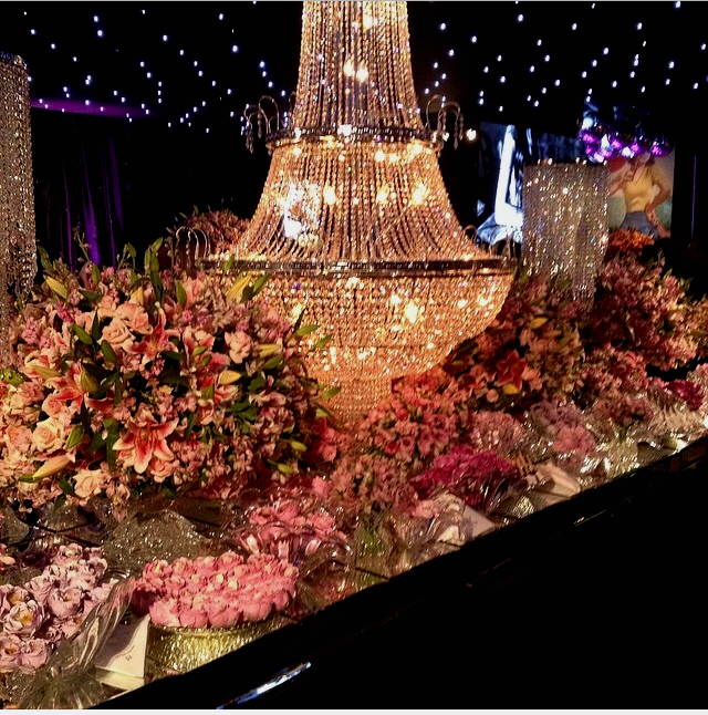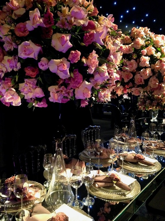 Logo na entrada , o salão era uma profusão de lustres de cristal, entremeados por tufos de flores no tom rosa afim de que já provocasse um impacto logo de cara! .
