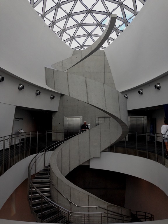 Afinal o prédio já é uma maravilha por si só, combinando o racional com o fantástico. De um simples retângulo surgem bolhas de vidro conhecidas como “ o enigma “. E dentro, uma maravilhosa escada une os 3 andares, fazendo uma homenagem à obsessão de DALI pela espiral perfeita.
