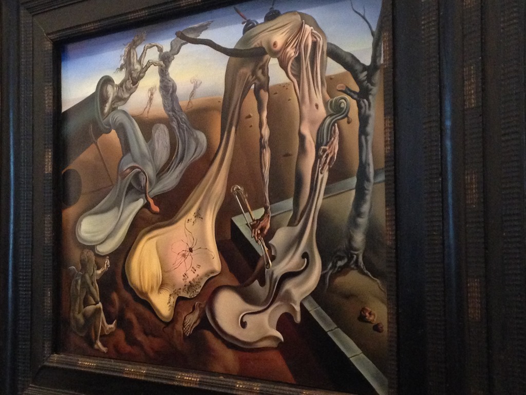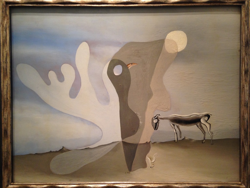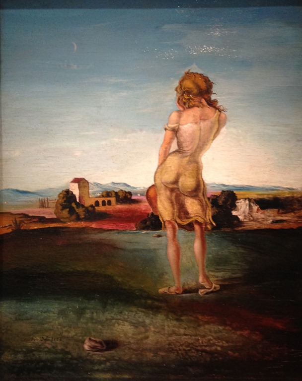 … até que conheceu o também espanhol PABLO PICASSO e mudou seu destino. Em 1925, leu A INTERPRETAÇÃO DOS SONHOS de Freud e passou a interpretar seus sonhos. Seu quadro Menina de Cachos de 1926, contém os pilares do Surrealismo, movimento que ele aderiria 3 anos depois: distorção da escala ( a menina é maior que a cidade ) , a anatomia exagerada ( dos glúteos ) e o erotismo.