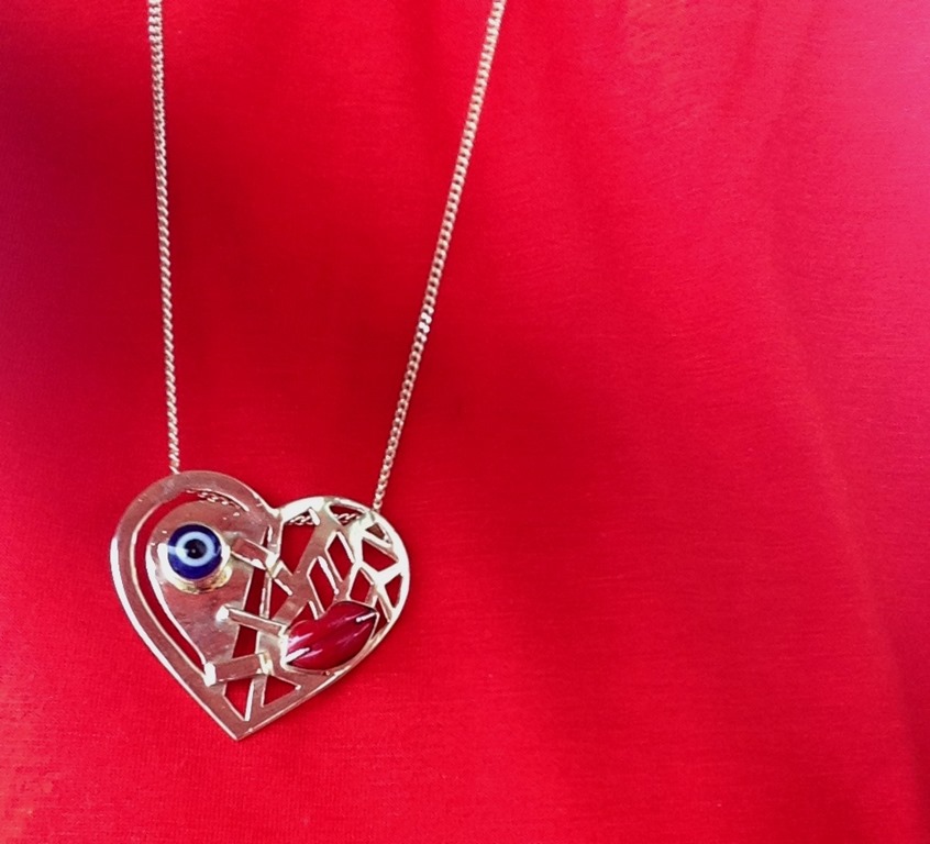Esse colar traz uma mensagem surrealista conforme expressão do pensamento : O que os olhos vêem e a boca fala, pode ferir um coração para sempre.