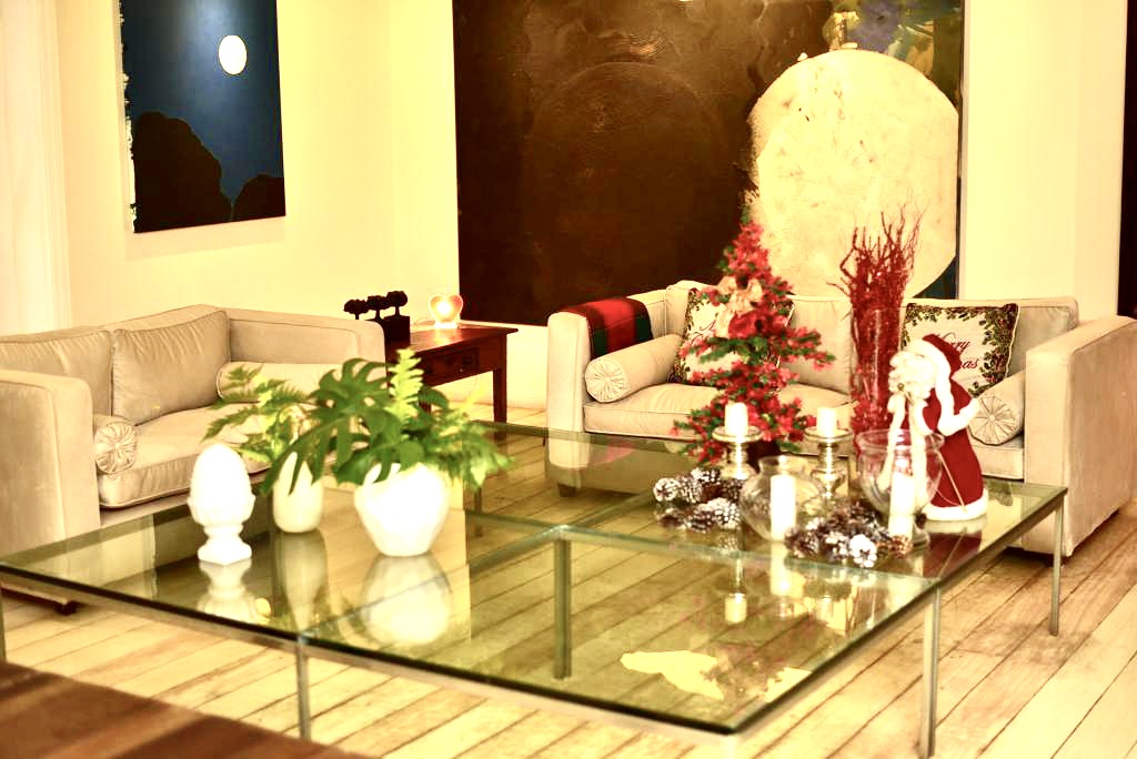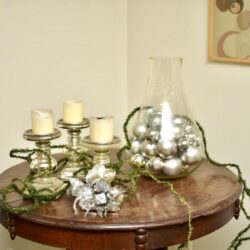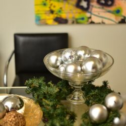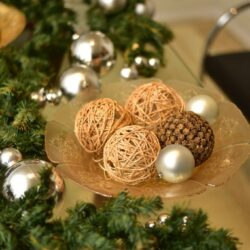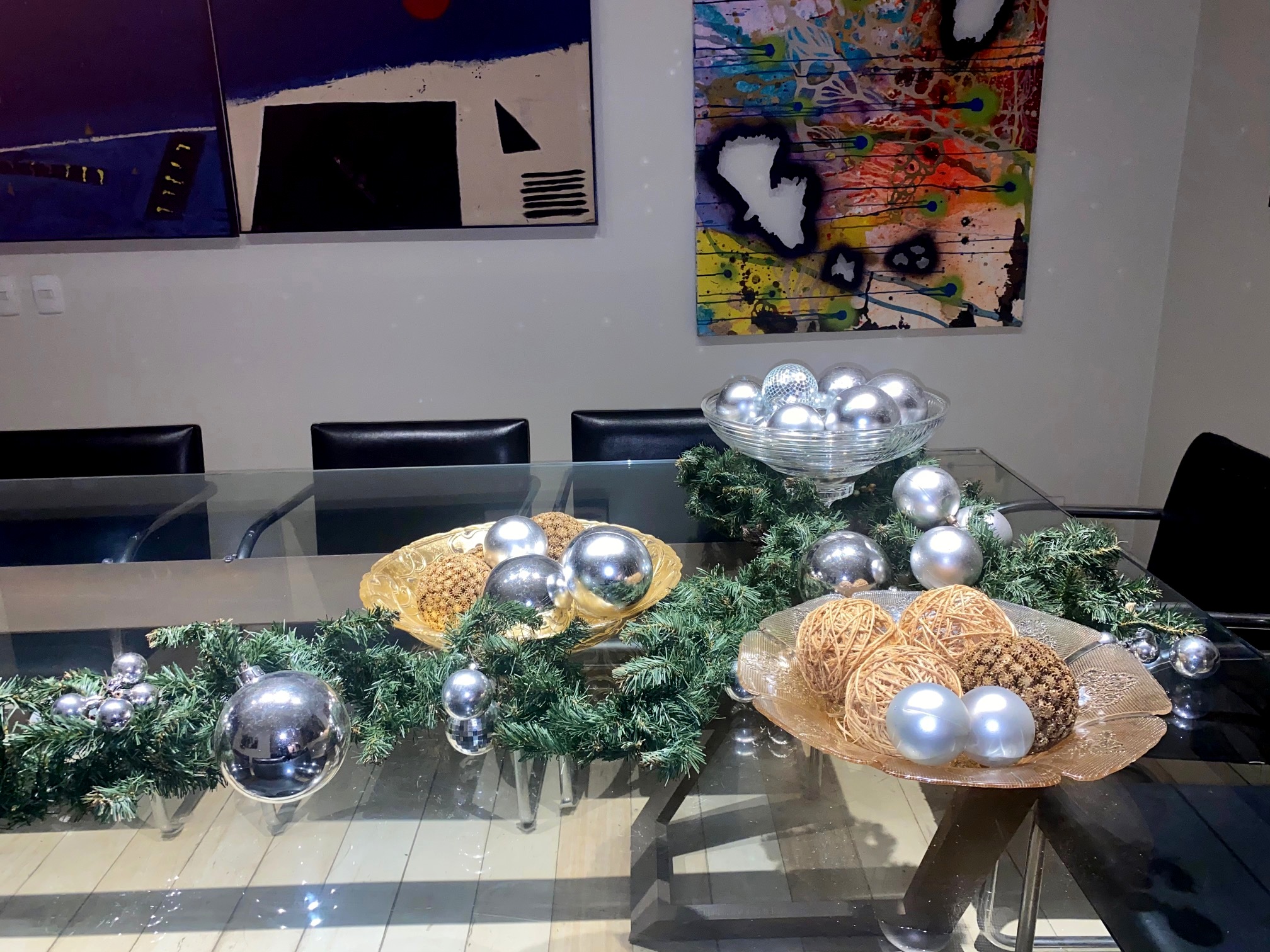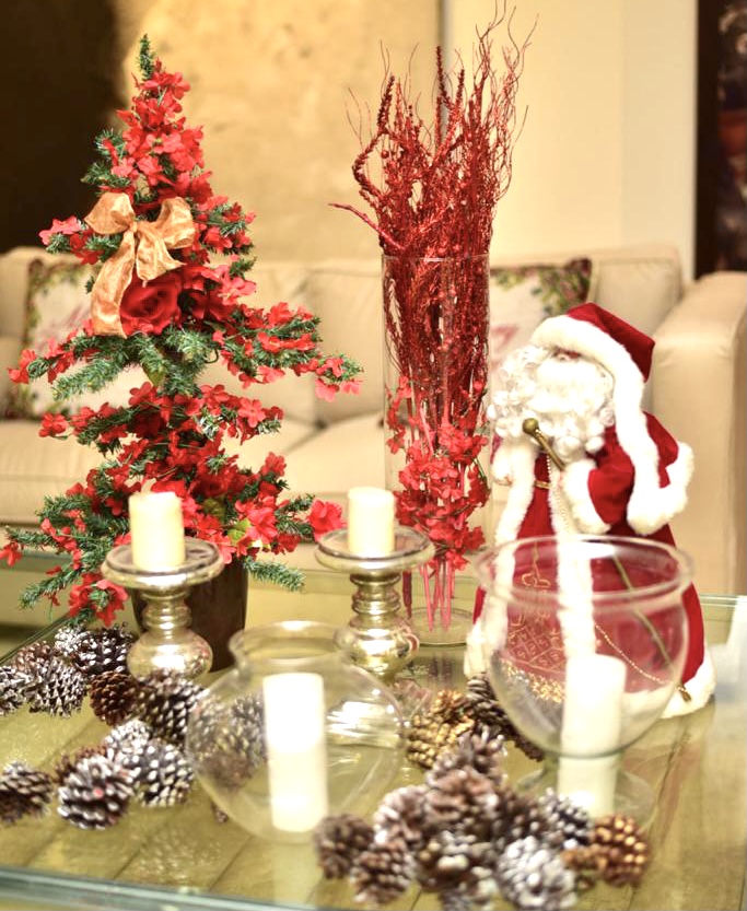 Como não usei as bolas prateadas na árvore, fui soltando arranjos pelos outros pontos da sala. Aliás, vidros, bolas, velas e pinhas sempre dão um lindo efeito final.