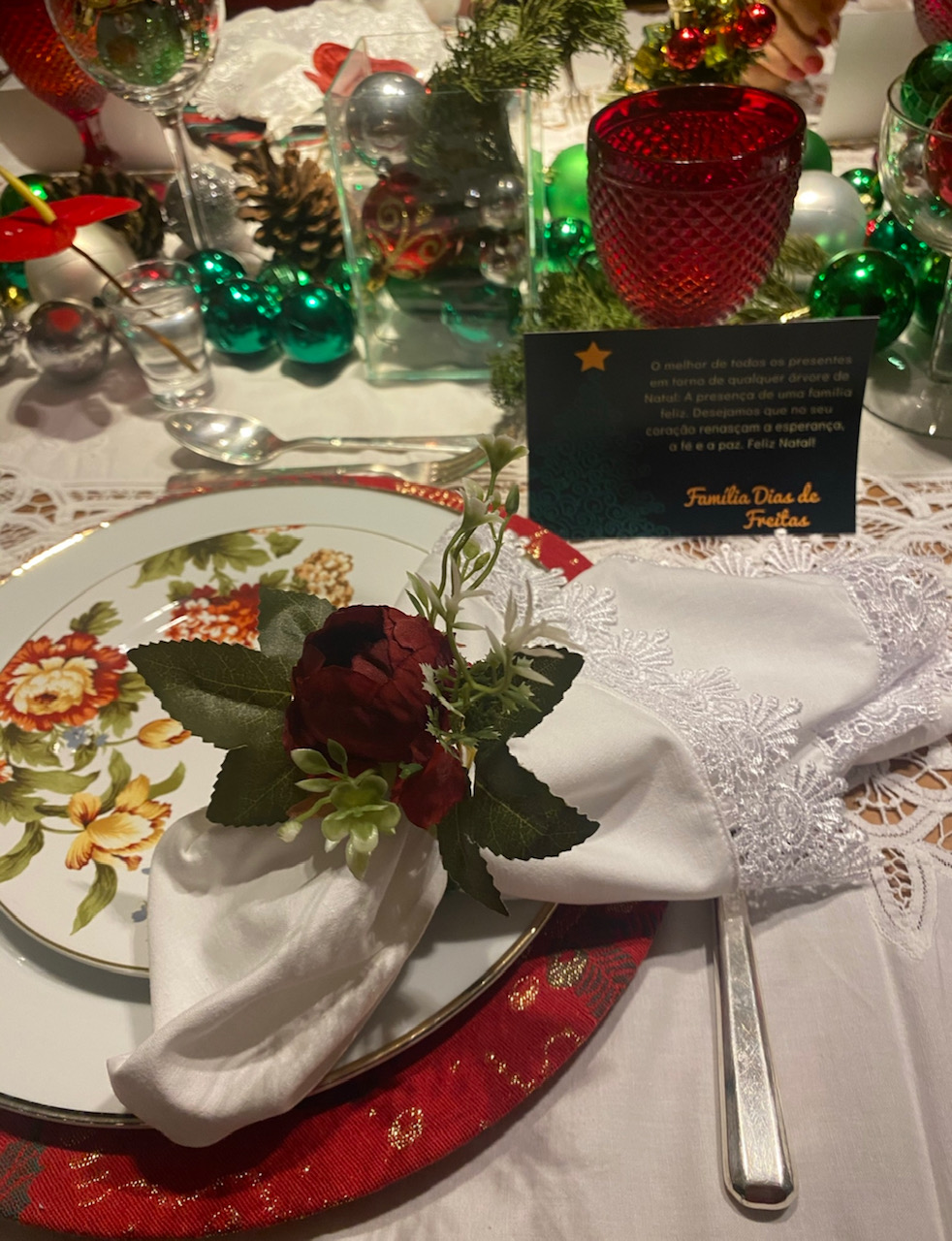A Rafa, que me puxou rsrs , frequentemente providencia alguma coisinha também. Então ela mandou imprimir essa mensagem em nome da família Dias de Freitas e colocou em cada lugar na mesa da ceia.