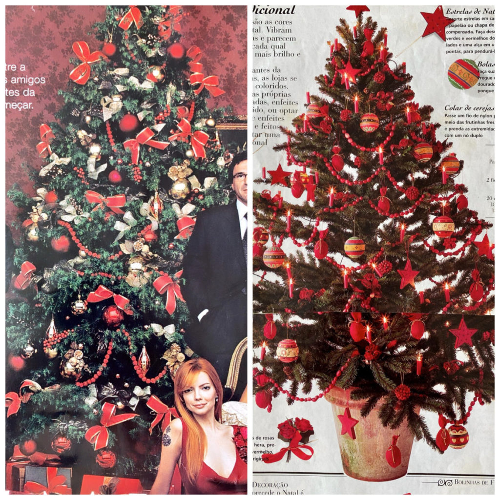 A árvore, estrela da festa, sempre dá o tom da decoração que vai seguir pela casa toda. Pego meu arquivo de ideias de revistas , pré-seleciono e, em seguida, escolhemos juntos a que iremos montar. Para esse ano, mais uma vez elas optaram pelo tradicional verde-vermelho-dourado, mas as duas árvores-inspiração tinham itens que nos chamaram a atenção.