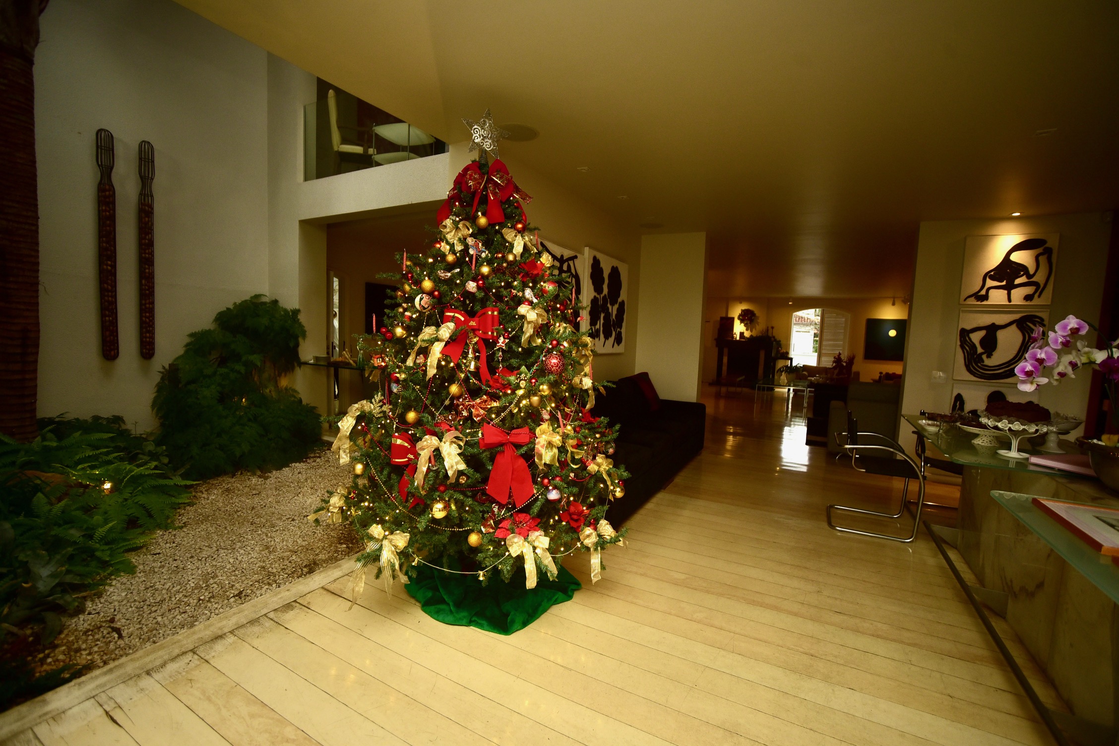 Também em verde, branco e vermelho, assim como a temática tradicional da árvore desse ano.