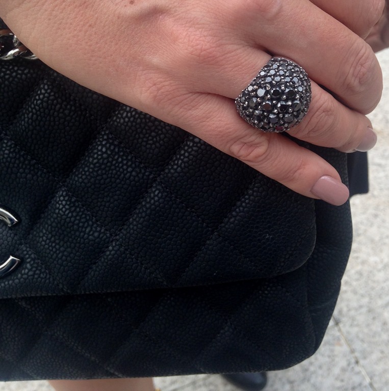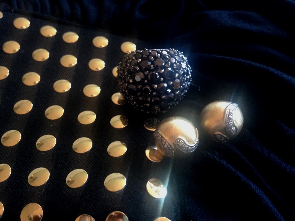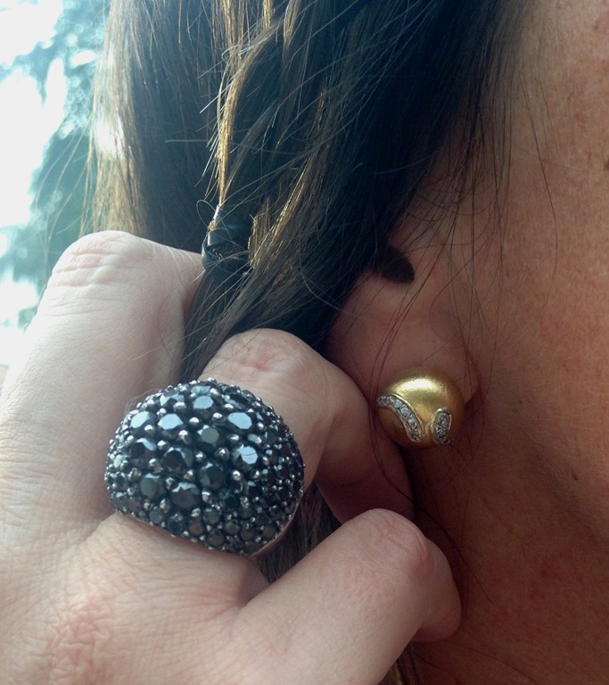 Brinco Vento ( 10 x 260,00 = 2600,00 ) e Anel Bola em brilhantes negros – Vestido CLÔ –