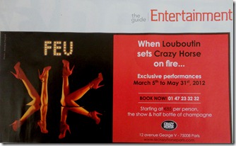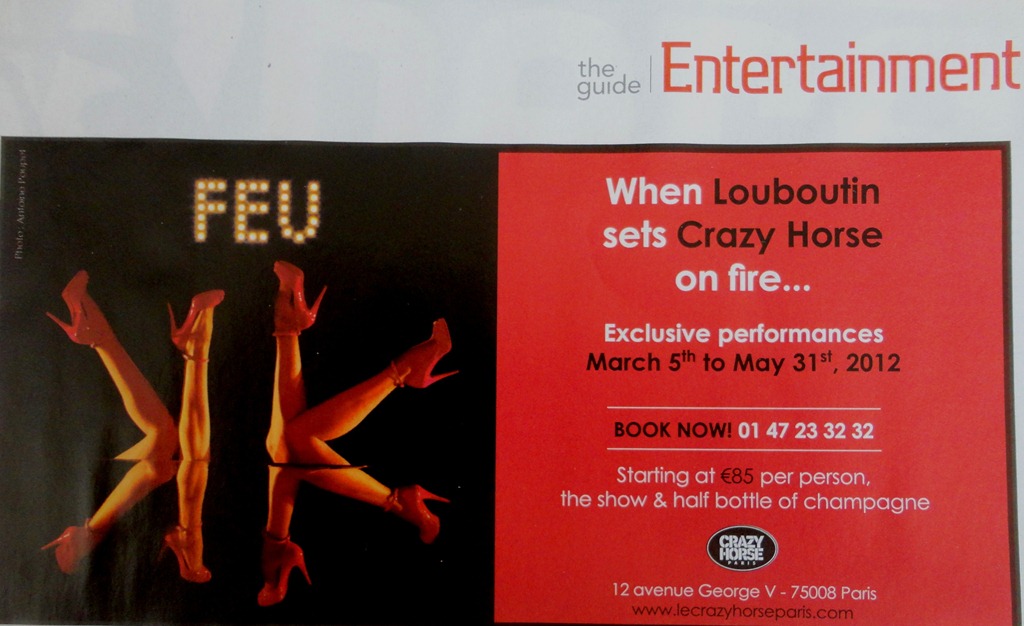CABARÉS- Acho que todo mundo deve ir,pelo menos uma vez.O mais tradicional é MOULIN ROUGE ,tanto pelo local (Montmartre ),quanto pelo show em si. Os mais luxuosos e à la Broadway são LIDÔ e CRAZY HORSE, ambos na região Champs Elysèe. Dessa vez,fomos à estréia do show FEU, no CRAZY HORSE, e esse era o talk-of-the town, pois o show foi desenhado por Louboutin , adicionando o fetiche “sapatos/pés” ao já fetichista assunto . E a estréia foi em meio à SEMANA DE MODA. Prestigiado como ele é… já viram,né?