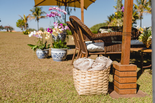 A decoradora soltou ombrellones e móveis pelo gramado sem agredir o ambiente nem o tema.
