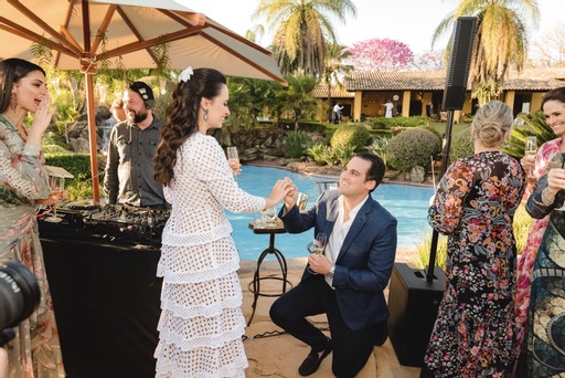 Meses depois, em julho, aconteceu o noivado na fazenda para os padrinhos e familiares, como é de tradição acontecer. Como os noivos são atletas do hipismo , escolheram esse lugar que tanto amam para selar esse compromisso publicamente.
