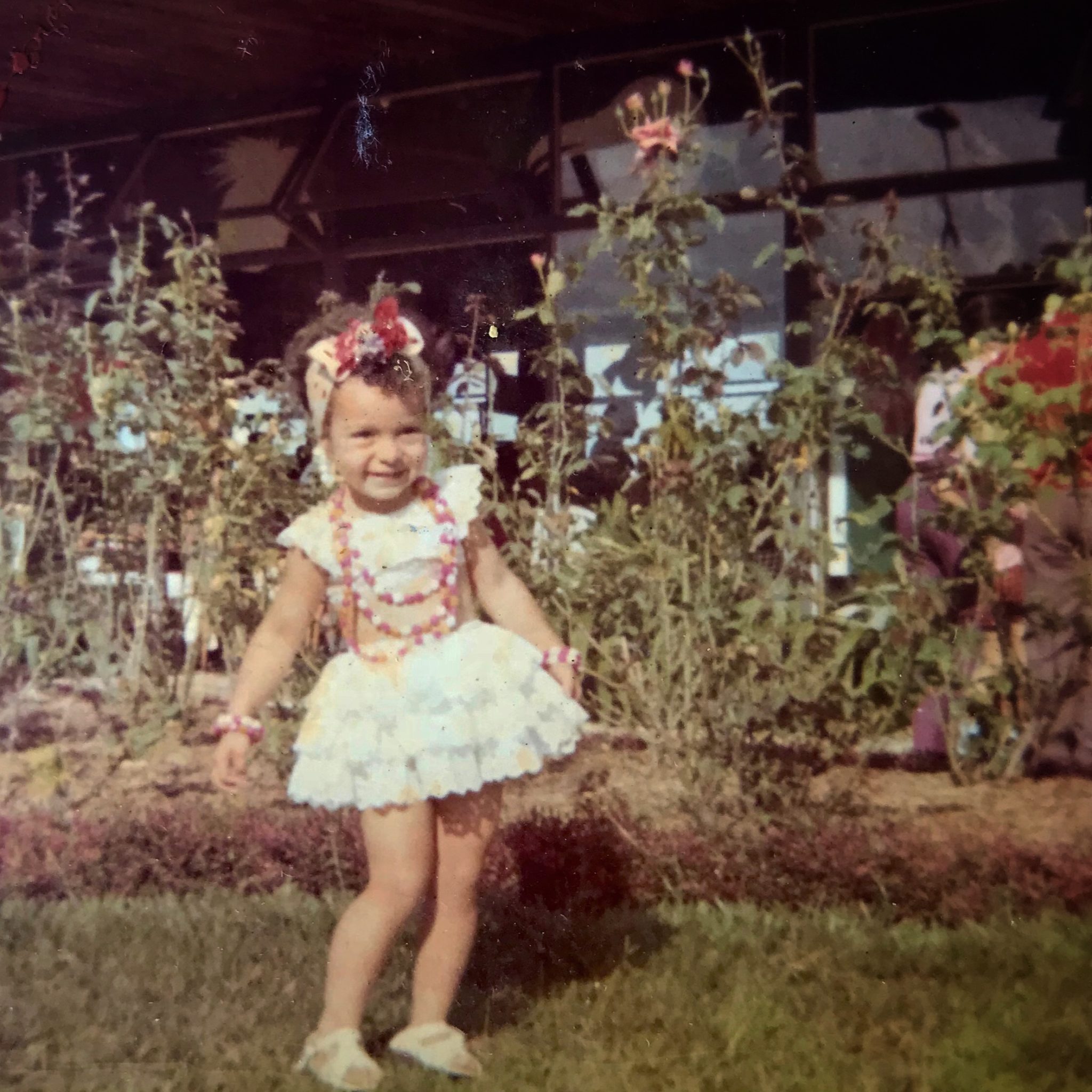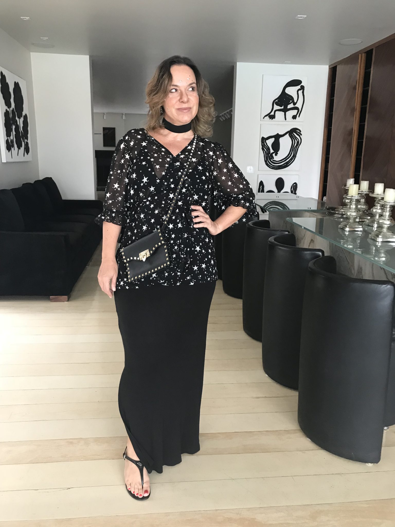 Ana fez uma espanhola estilizada. Bastou uma flor no cabelo, uma argola PD e um saião florido para entrar no tema.
