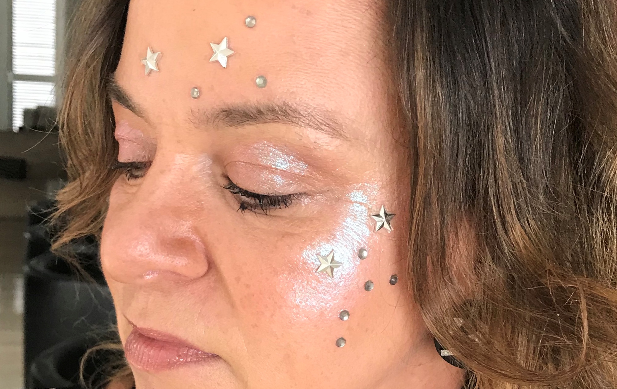 O glitter você aplica sobre uma camada fininha de hidratante ou de uma passada de dedo de cola de cílios. A mesma cola eu usei para fixar os brilhos e as estrelinhas. Embora já sejam adesivos, prefiro dar um reforço extra para não cair durante o dia com o calor.