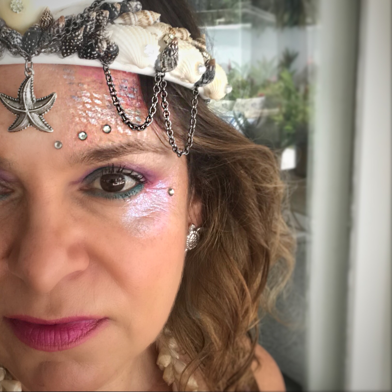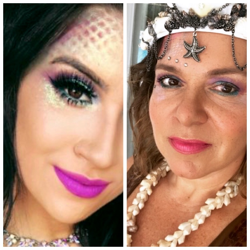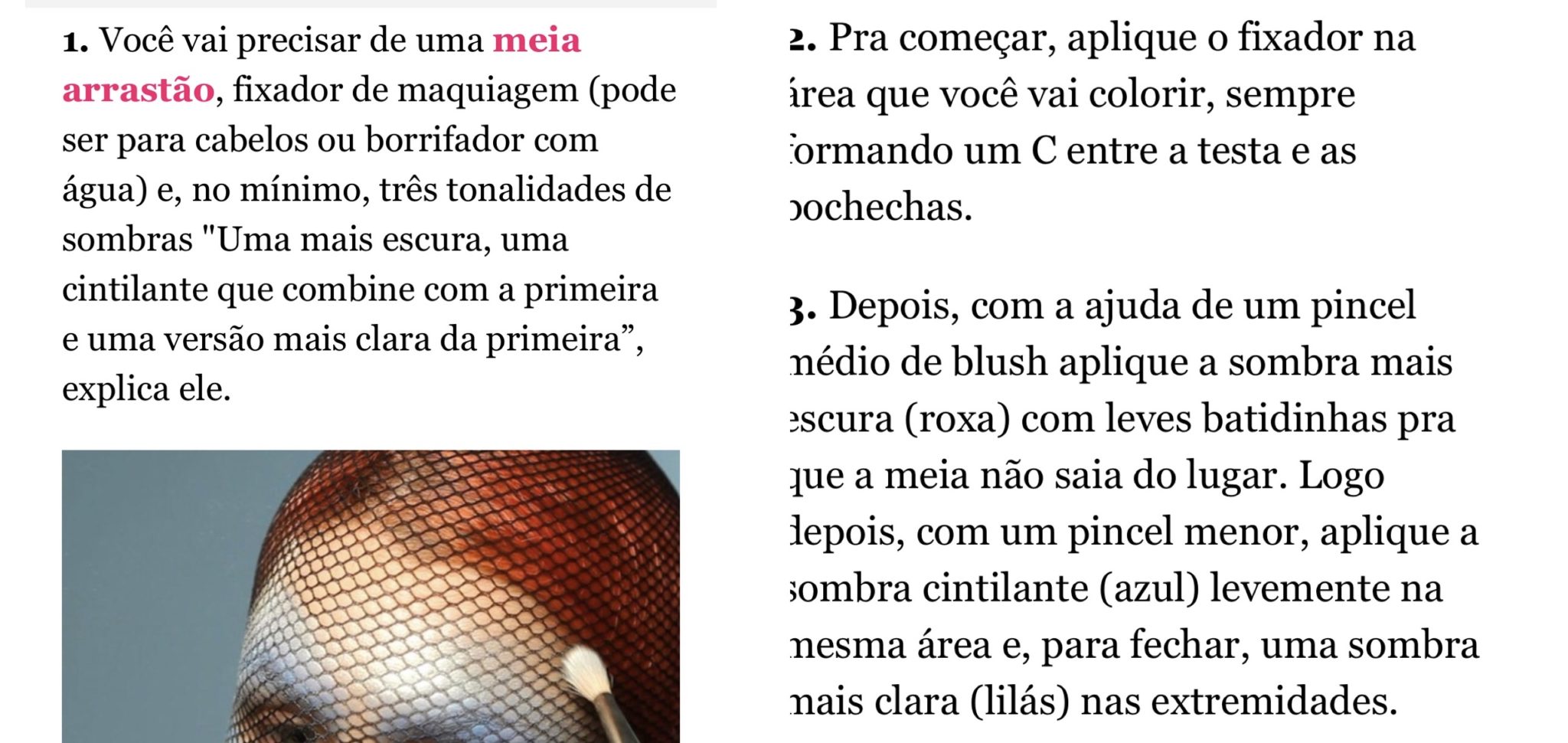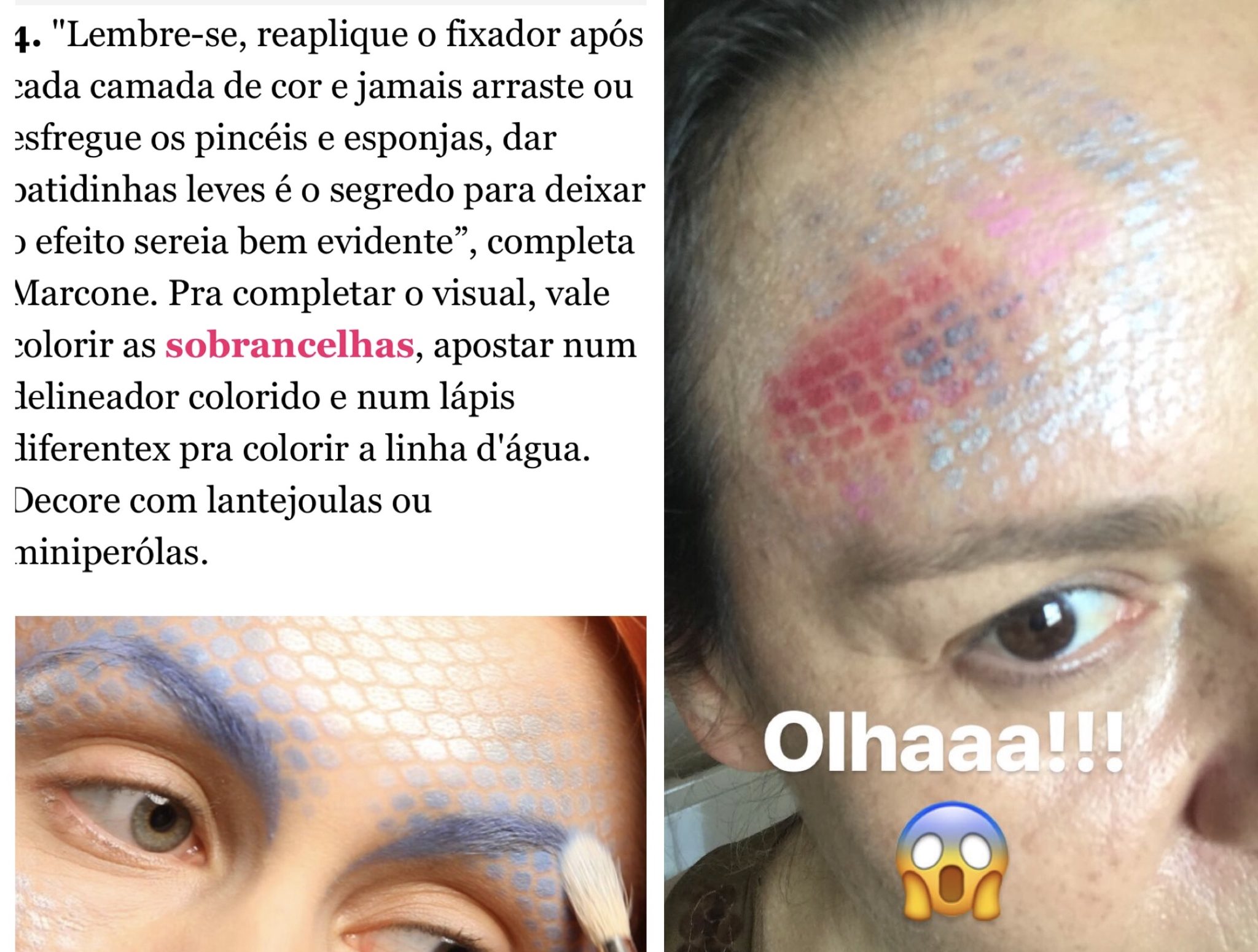 Como a roupa que eu tinha era em tons bem fechados, fui buscar na internet uma “MAQUIAGEM DE SEREIA” para dar um incrementada no look. Veja o tutorial abaixo.