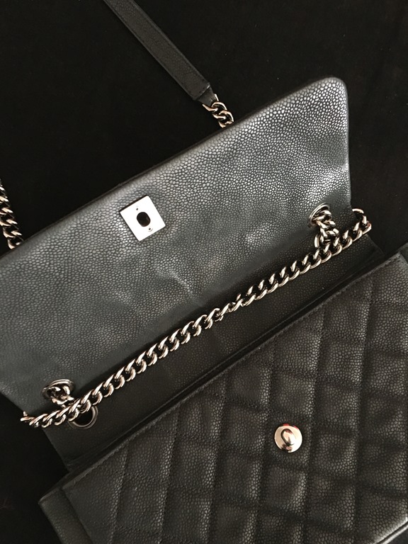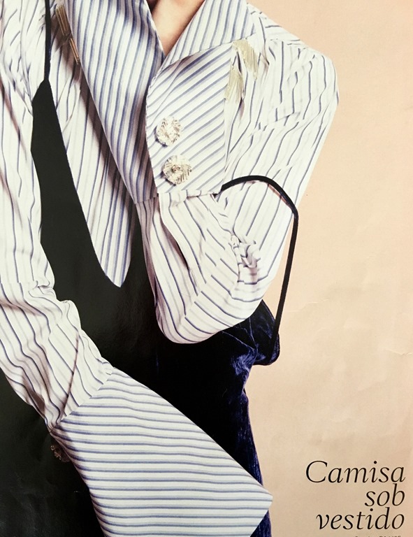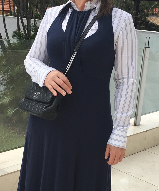 Então : eu tinha tudo – um vestido azul e uma camisa listrada – fala sério: quem não tem? Sapatilha e bolsa CHANEL – passei a alça por dentro para ficar “ mais curtinha “