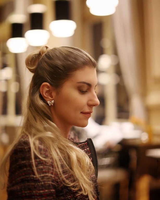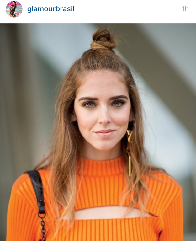 O cabelo? Um meio-coque ( half-bun ) , já falei dele AQUI . Tá todo mundo usando : de Chiara Ferragni a Cris Vallias .