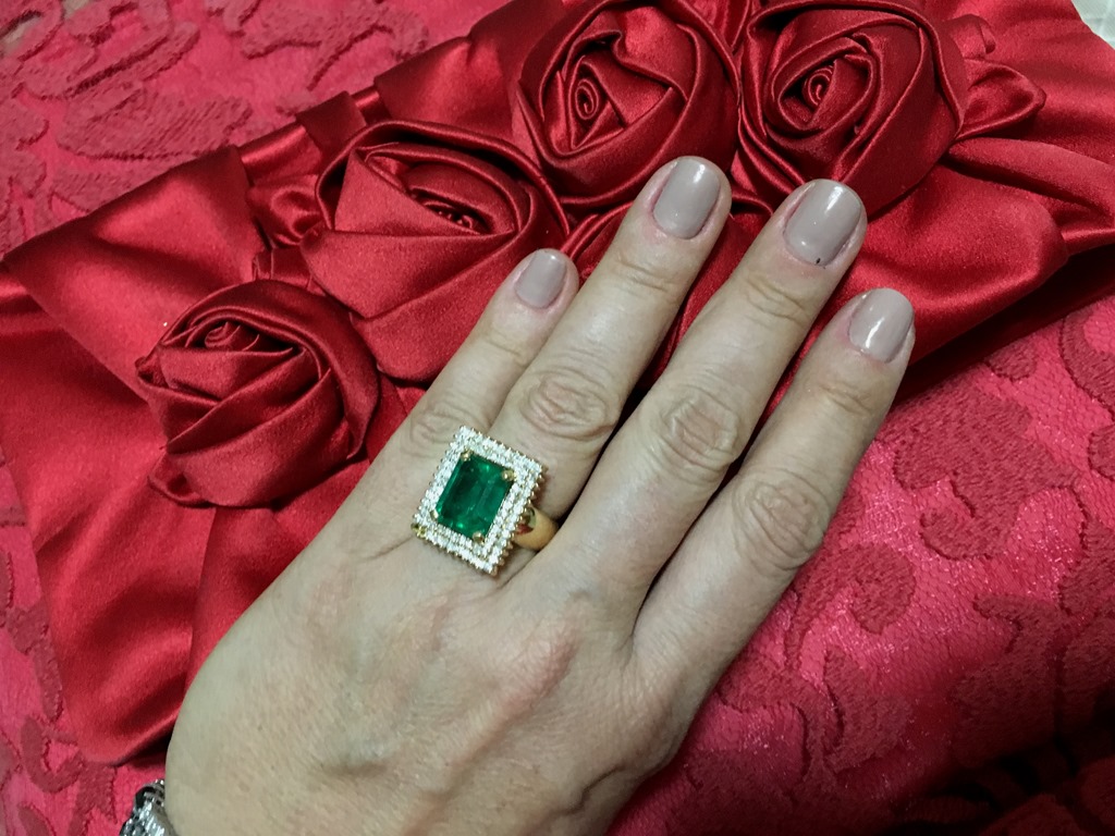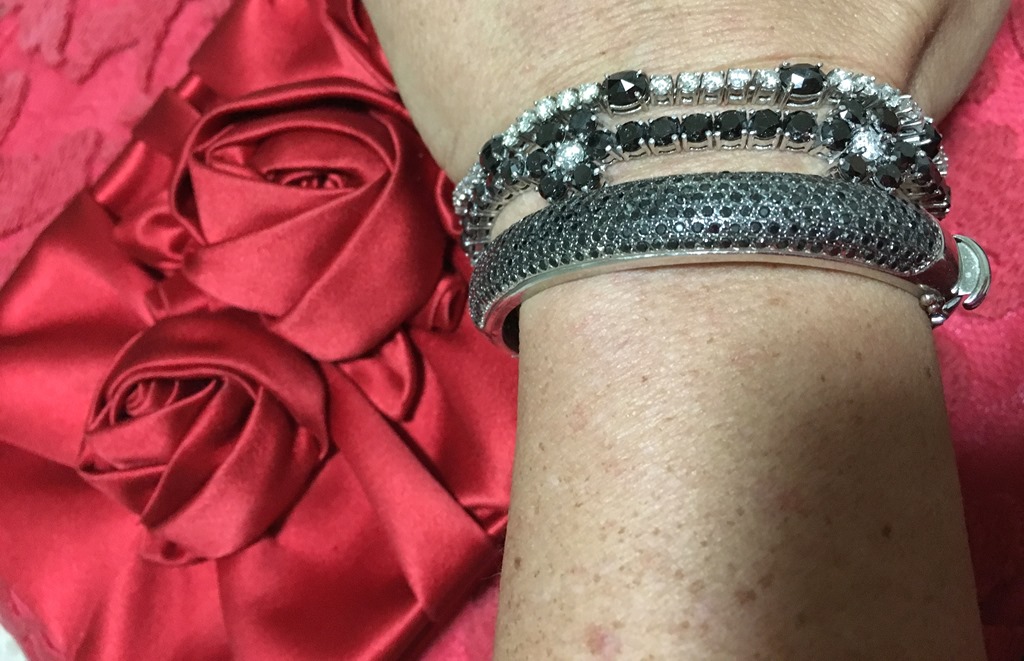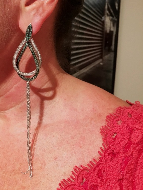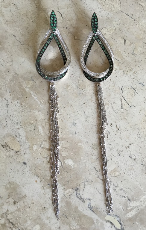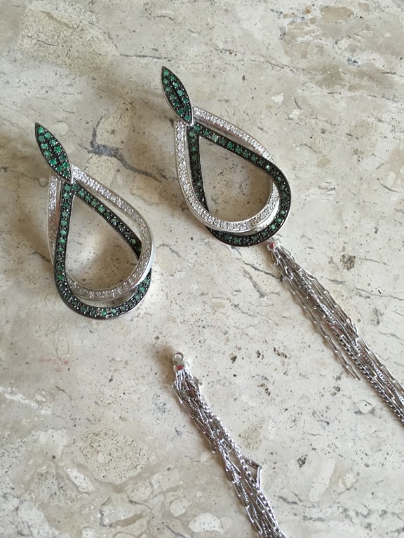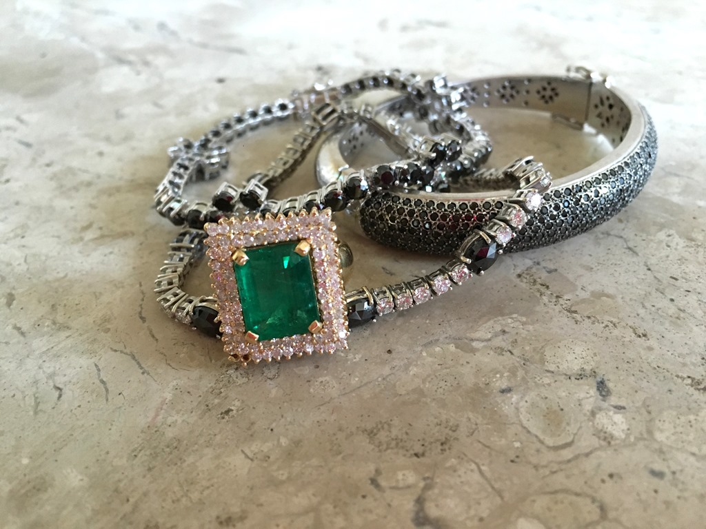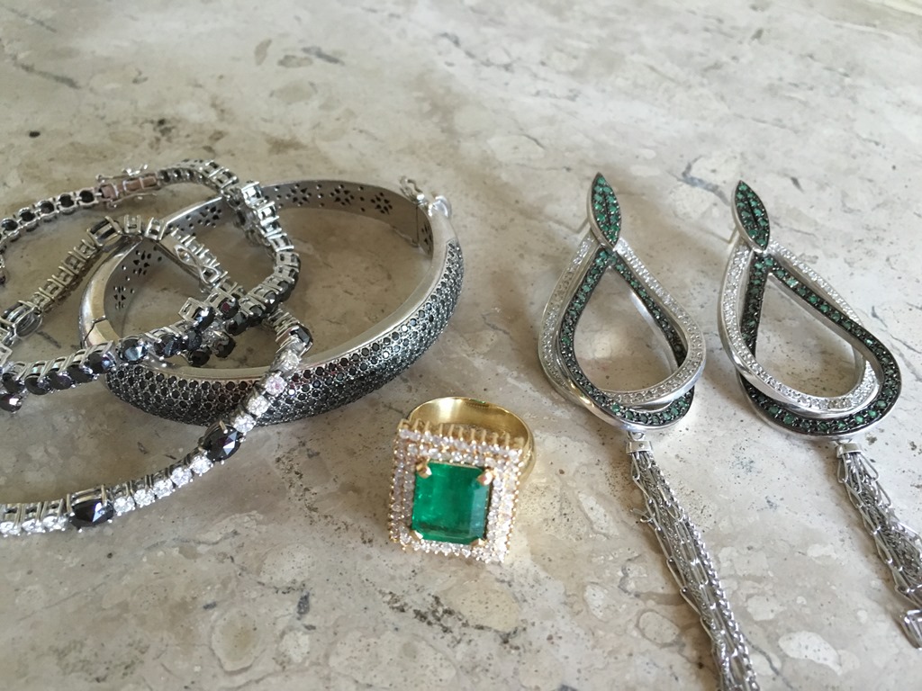 jóias em brilhantes brancos e negros e um toque de verde das esmeraldas