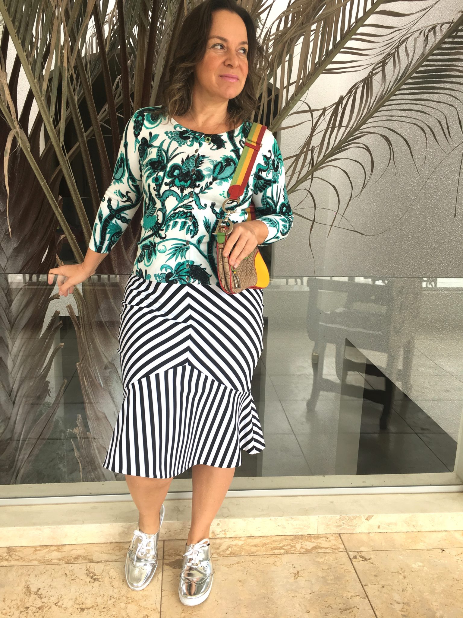 Eu não fui de antiga, but … fui de “moderninha”. Gosto muito de ousar na mistura de estampas quando estou no mood. O sapato flatforms prateado completou o look e investi ainda em um traço de delineador verde, batom rosinha SNOB da MAC e esmeraldas JOIAS PD.