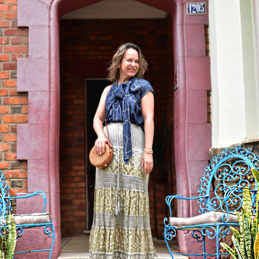 A moda do RONALDO FRAGA é também bastante conceitual, não seguindo tendências ou modismos. Essa blusa tem bordados no jeans, um laço enorme e um shape diferenciado. Dá para usar despretensiosamente com outras peças, como essa saia indiana.