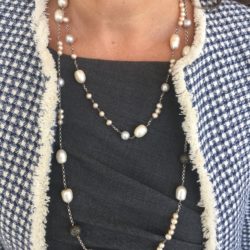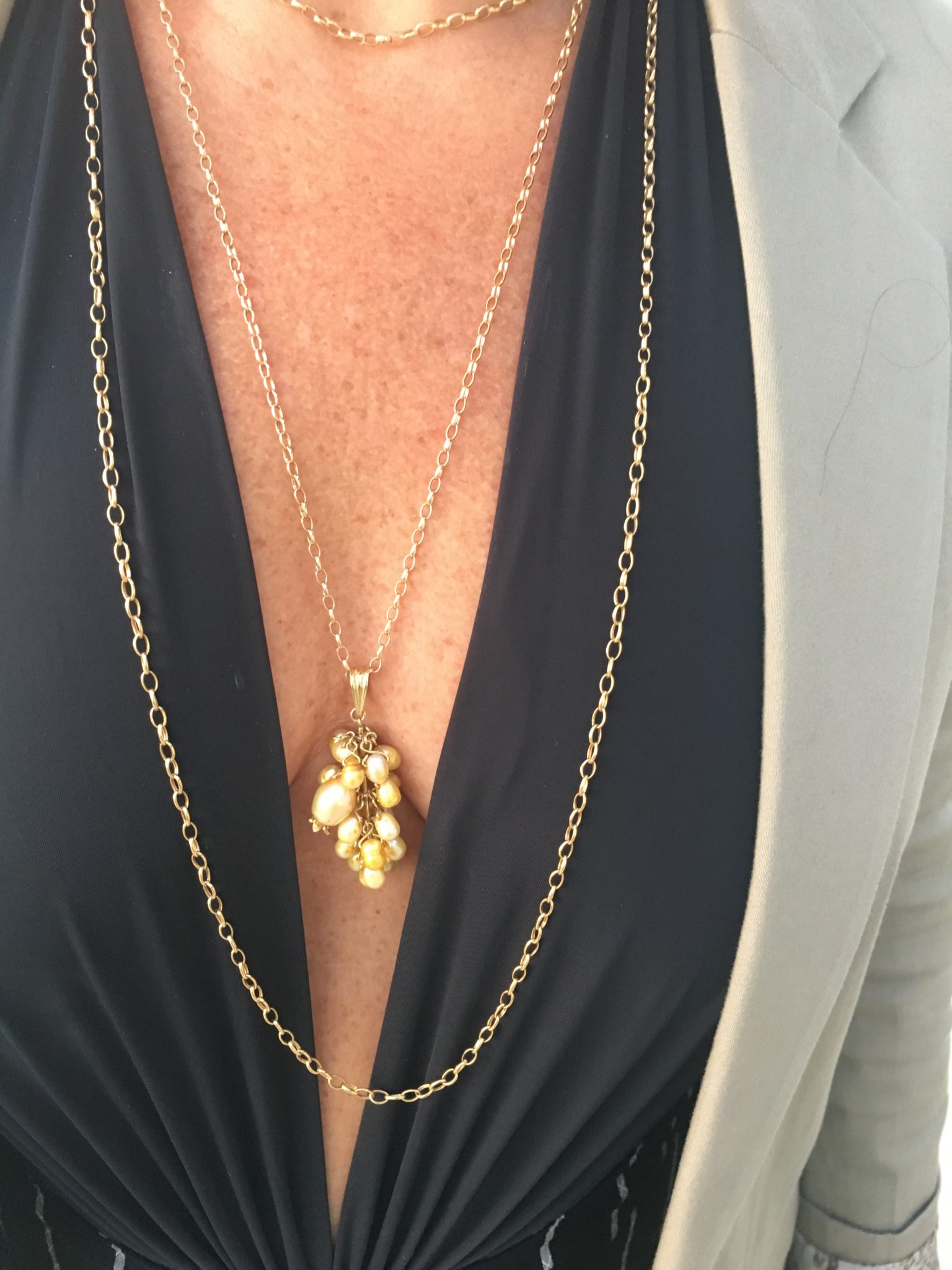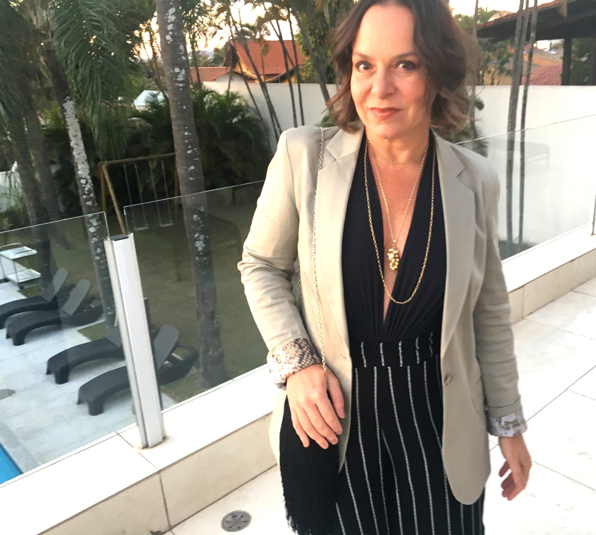 Esse foi o look que usei na inauguração da filial do Salão Ana Araújo no Shopping Cidade. Era uma 3a. feira fria de início de Agosto. Usei alfaiataria ( blazer + pantalona ) quebrada por um body decotado que preenchi com colares JOIAS PD. Na verdade, são correntes de elos avulsas e um pingente em pérolas douradas pendurado em uma delas.