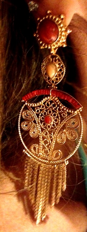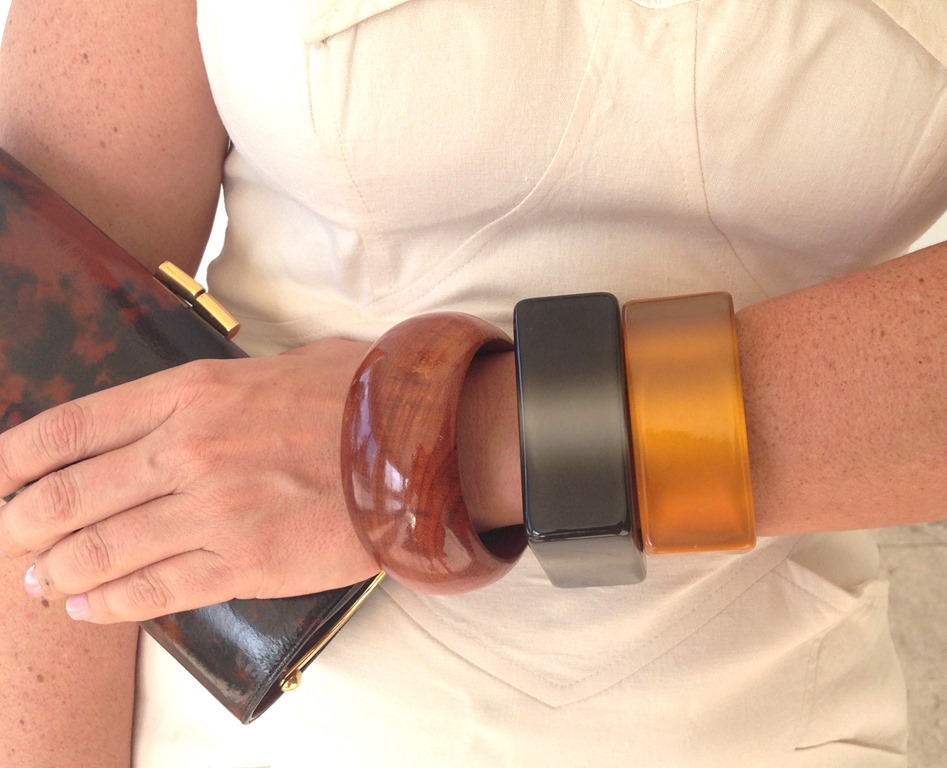 A pitada fashion do look foi a mistura de pulseiras de resina e madeira bem geométricas contrastando com o brinco delicado – mas de personalidade – JÓIAS PD.