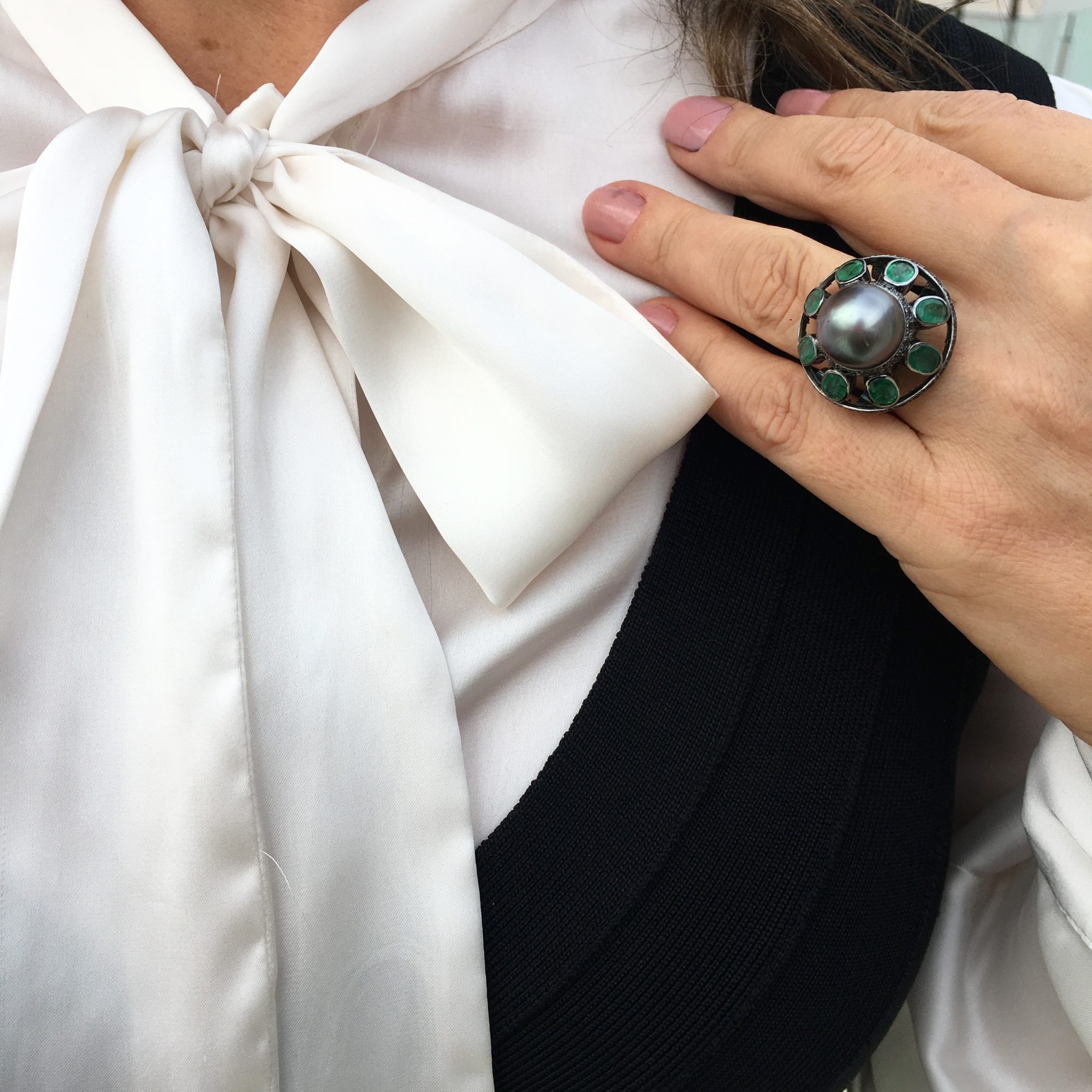 Brinco em esmeraldas, brilhantes e pedras | Anel em esmeraldas, brilhantes negros e pérola South Sea.