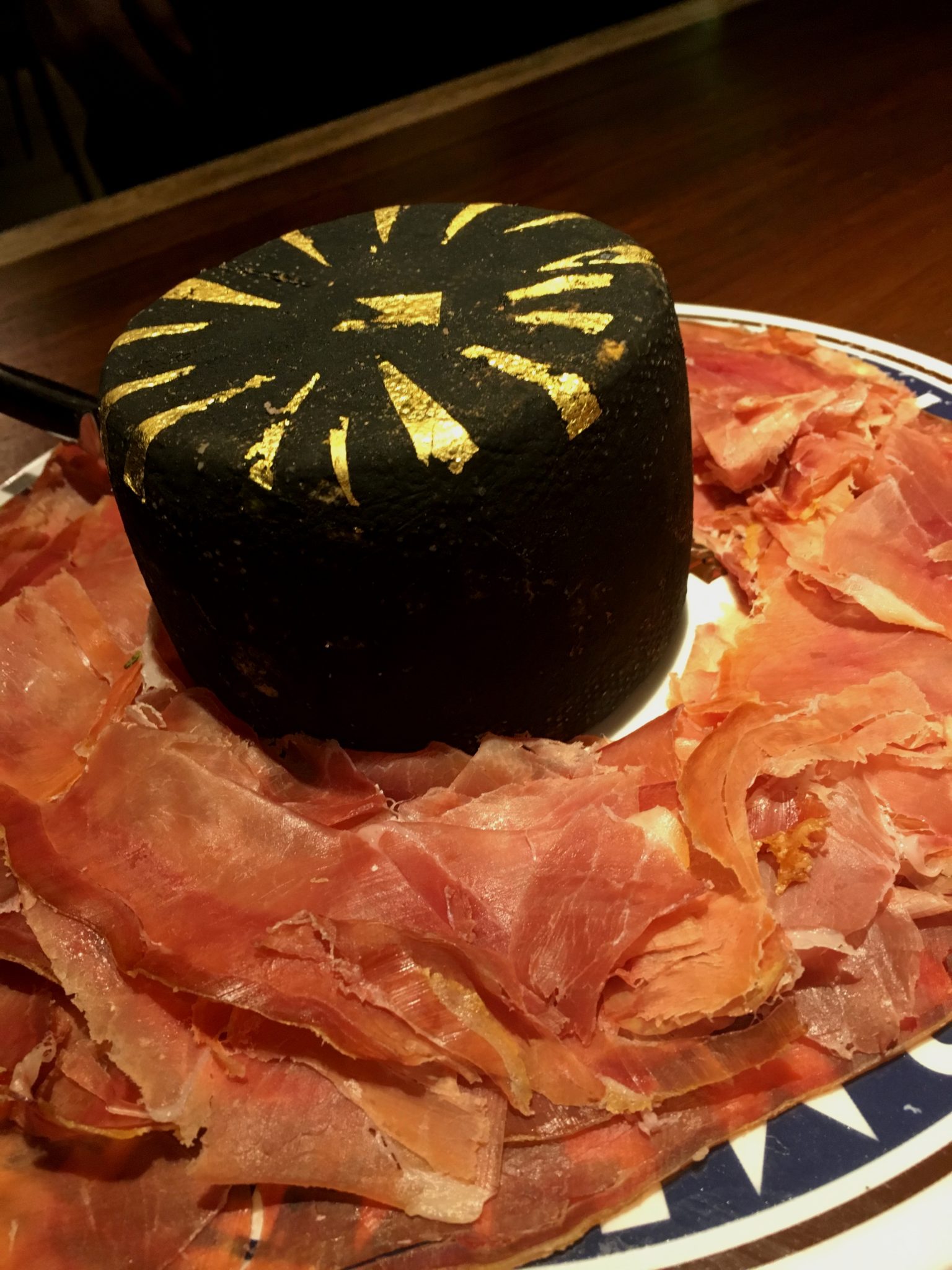 E se é para ser chique, eles foram! Serviram esse queijo Parmigiano Reggiano da VACCHE ROSSE , um consórcio que garante e controla a produção desse, que é considerado o melhor queijo do mundo. Fui pesquisar um pouco mais sobre, e se você clicar no azul, vai ficar exatamente como estou agora: com vontade de conhecer PARMA , região produtora não só dos melhores queijos parmeggianos, como também do famoso presunto cru. E foi exatamente assim que serviram essa maravilha ( nessa caso, ainda com folhas de ouro! ): com presunto parma e fatias de pão italiano. O vinho? Brunello de Montalcino – tem melhor combinação?