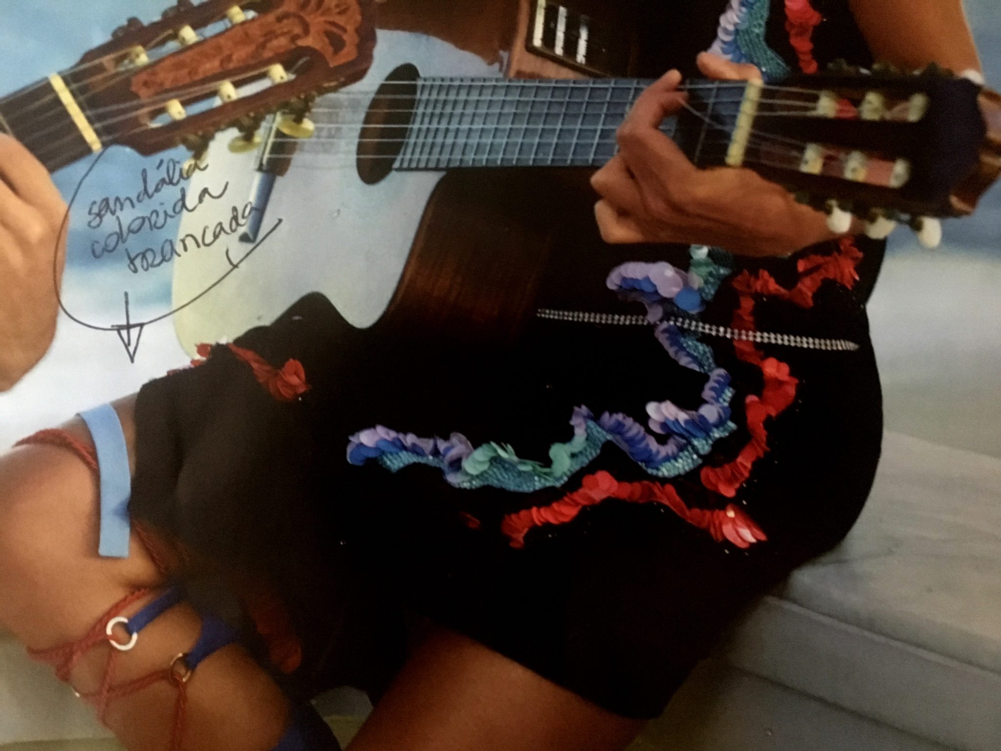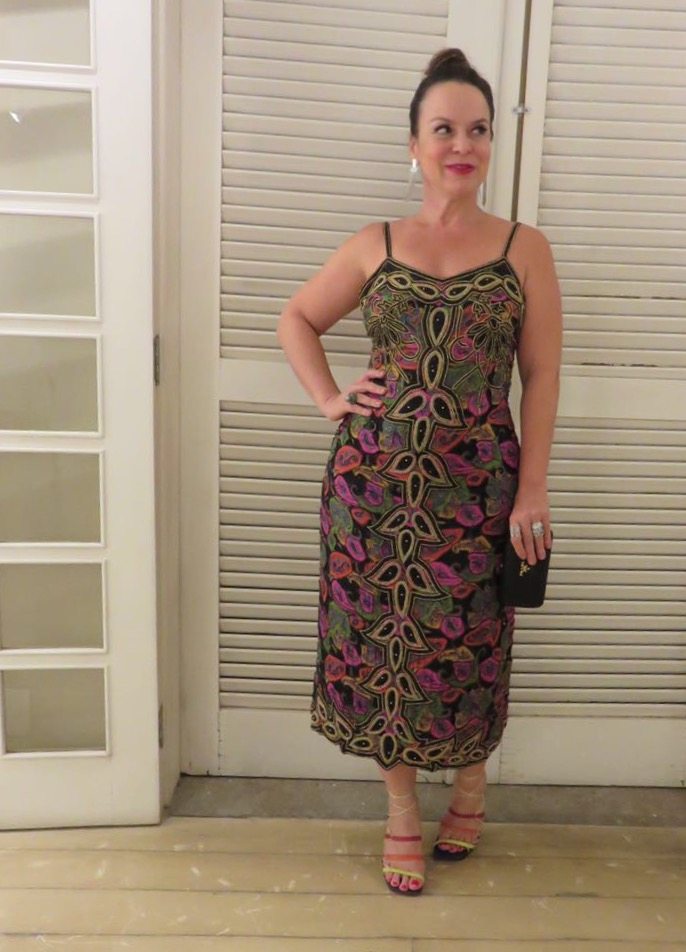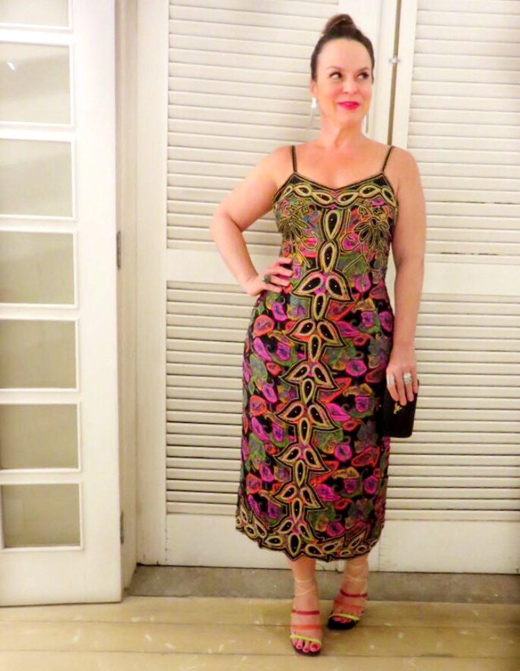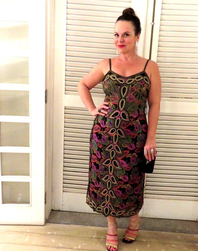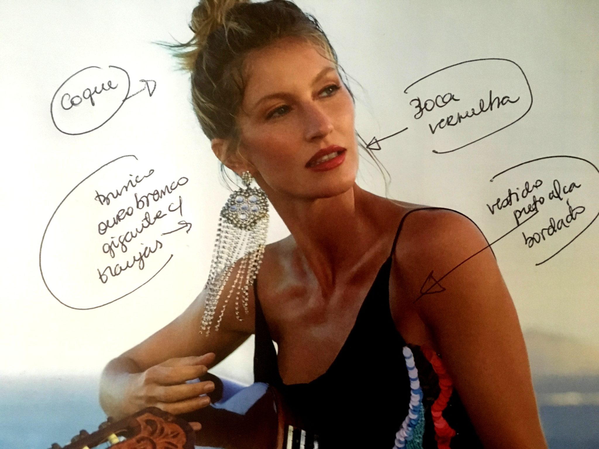 Busquei a minha inspiração num look Gisele da VOGUE novembro. Gostei da mistura de vestido bordado + brinco de franjas + sandália colorida + coque + boca vemelha. Tinha tudo, foi só agrupar as pecinhas.