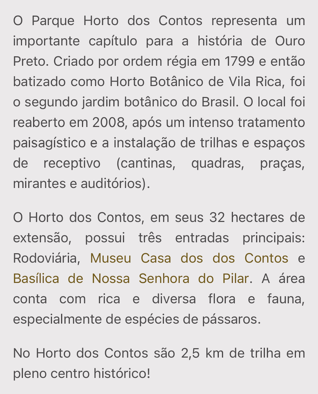 São 2,5 km entre riachos, cachoeiras, natureza, mirantes, bem como prédios históricos . Semelhantemente, o final não é menos impactante: termina na Igreja do Pilar, a 2a. mais rica em ouro do Brasil.