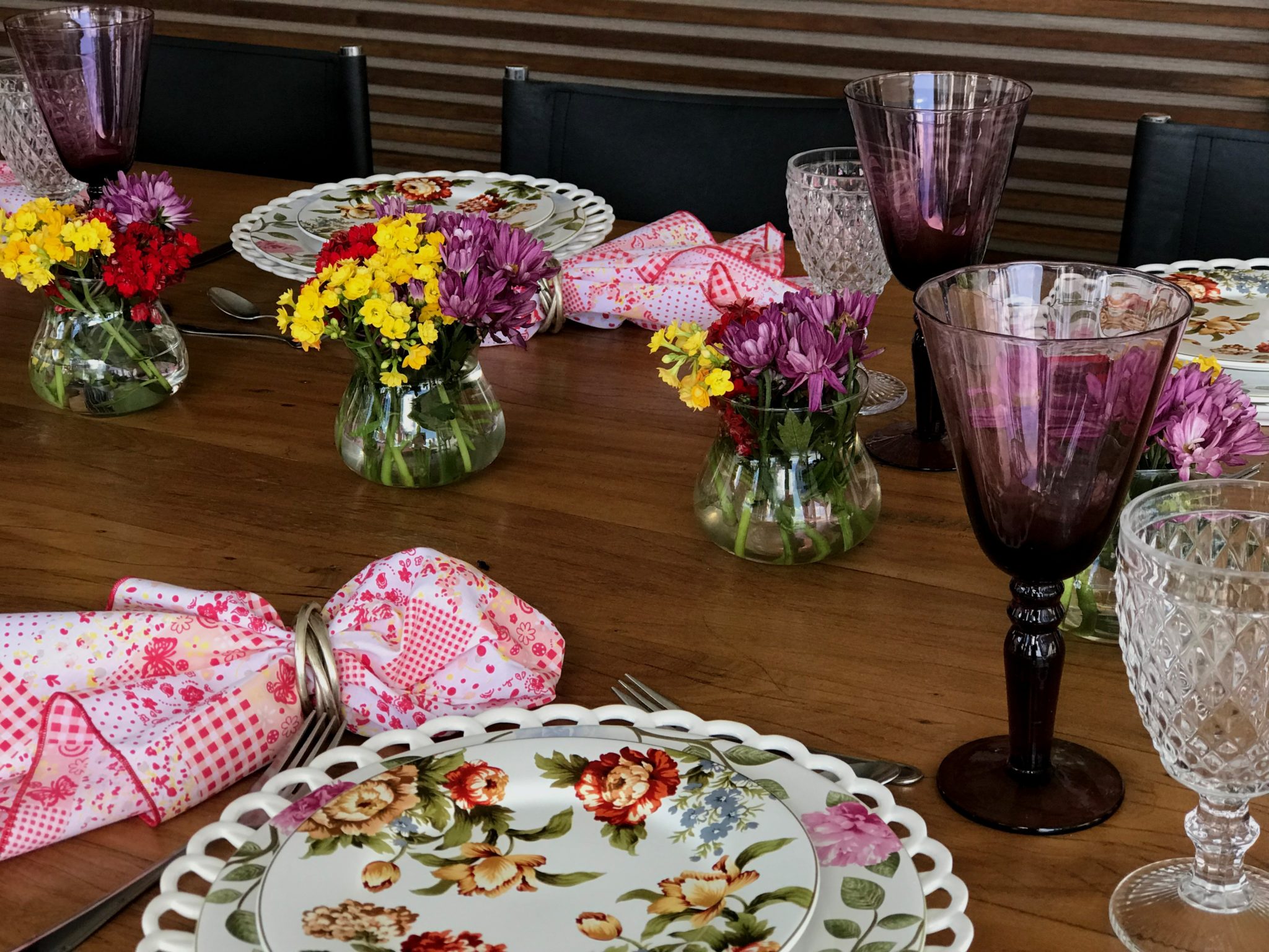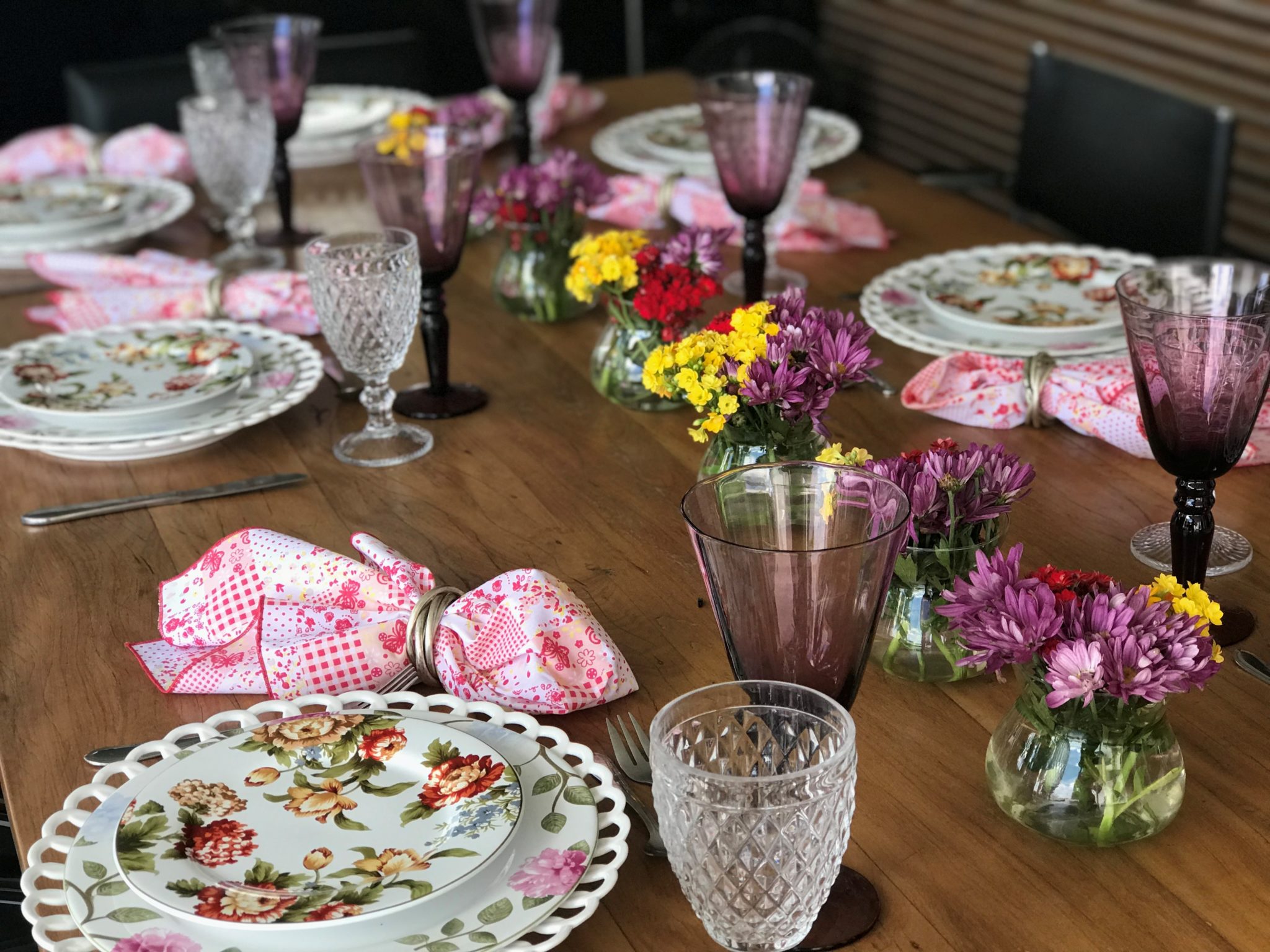 Repare nos pratos: ambos são florais, mas são diferentes! O guardanapo ainda entra com uma 3a. composição de flores, alegrando mais ainda a cena!