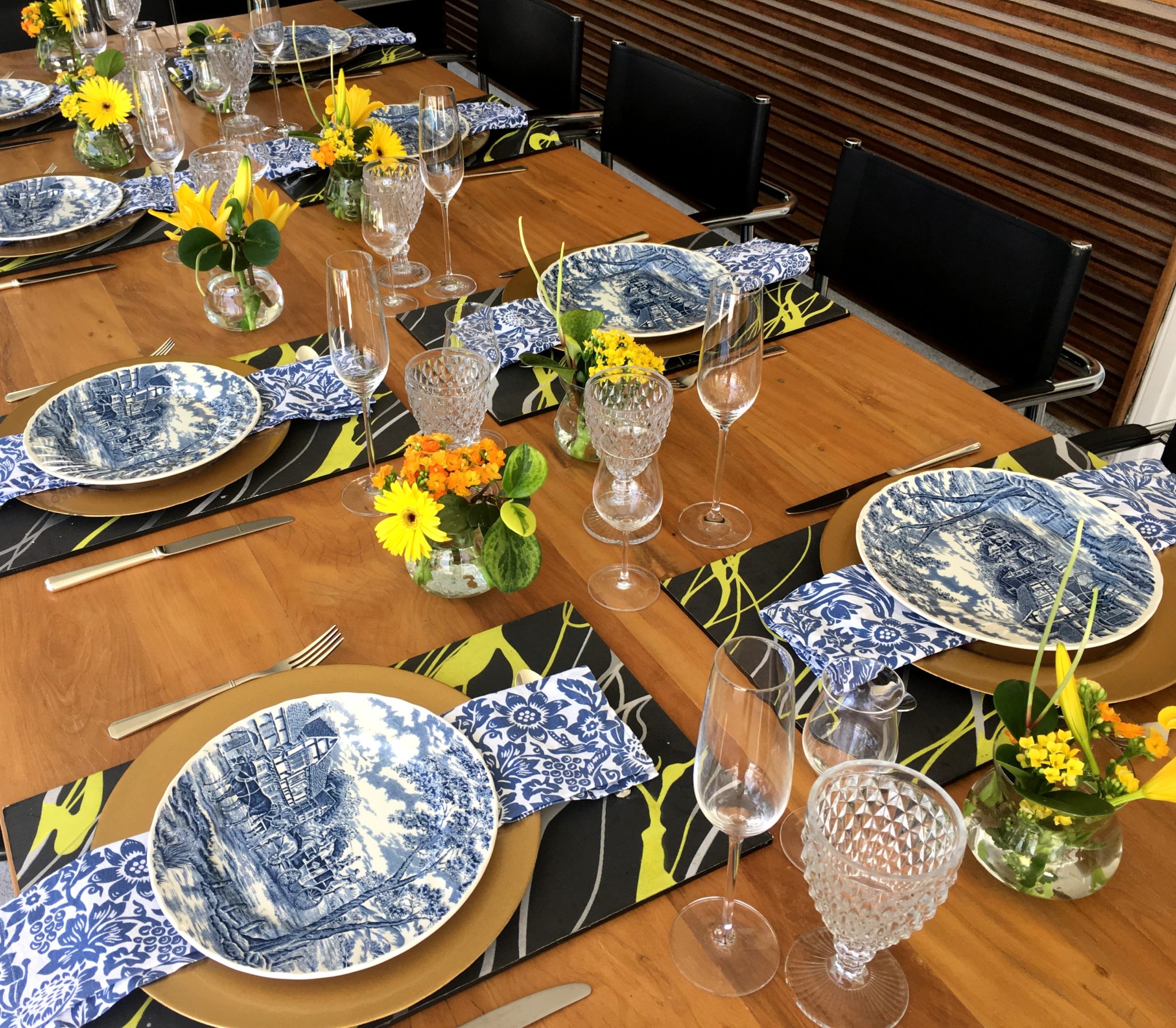 As estampas dos pratos e guardanapos são ambas azuis, mas são diferentes. Veja essa mesa AQUI.