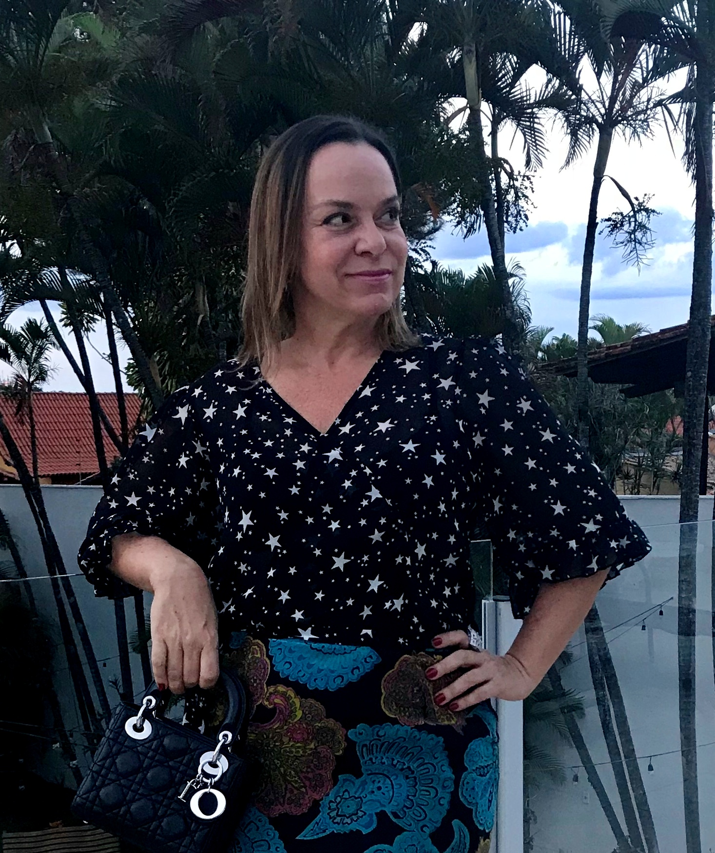 – Outra opção é escolher uma estampa para ser o destaque do look e outra para exercer um papel secundário, assim você não sobrecarrega o look. ( Nesse caso, escolhi as estrelinhas como o menor padrão de estampa e ainda a elegi como principal, trazendo essa unidade também para a joia!)